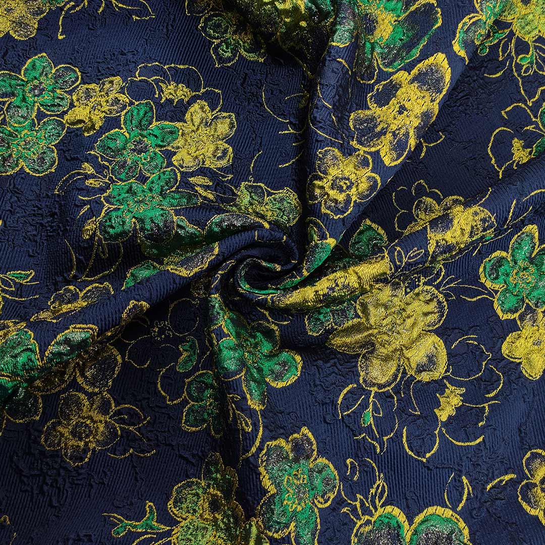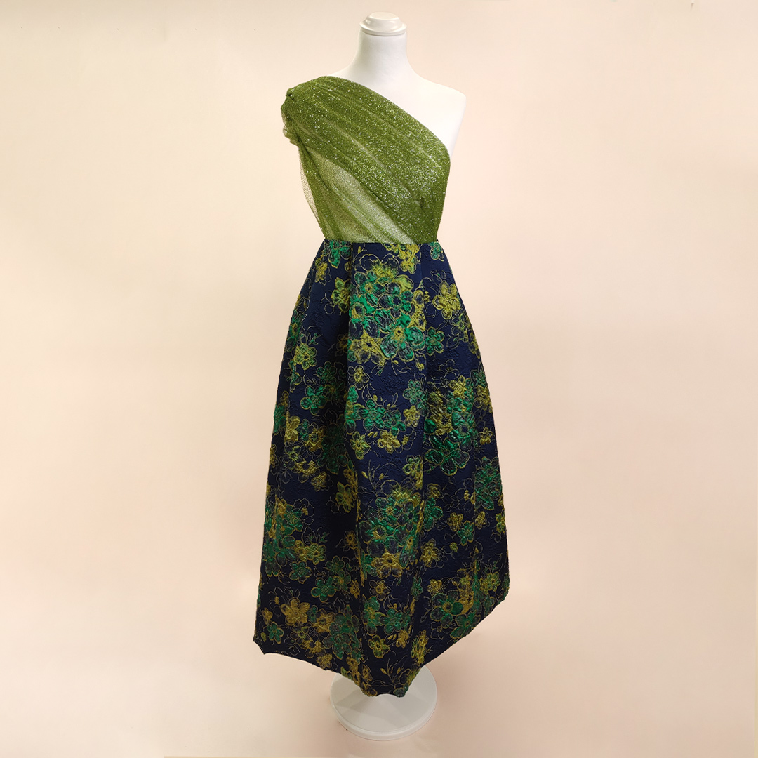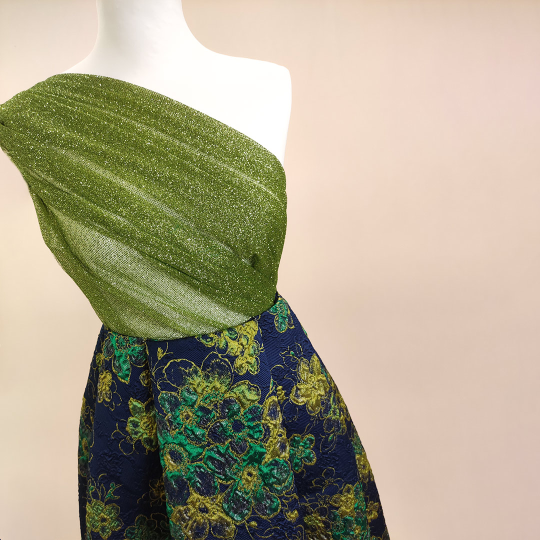 Tessuto Broccato in seta motivo floreale abbinato a tessuto Tulle Glitter in tinta unita verde acido.