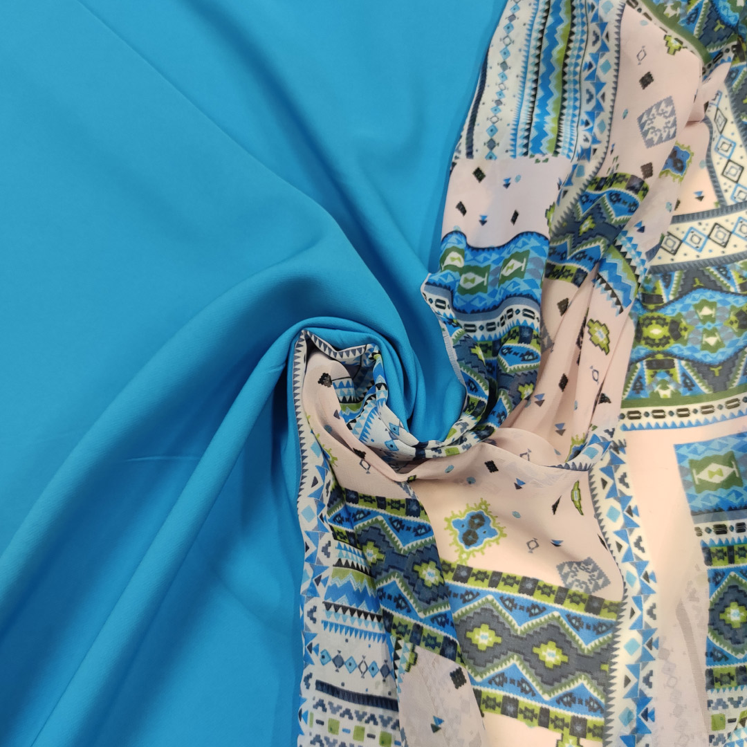 Tessuto Georgette a fantasia abbinato a Tessuto Cady elasticizzato in tinta unita azzurro.
