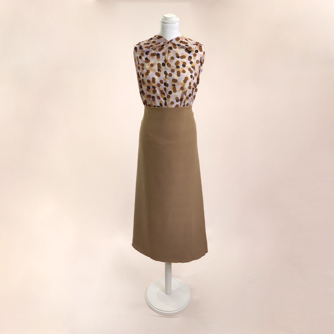 Tessuto Georgette a fantasia abbinato a Tessuto Cady elasticizzato in tinta unita beige.