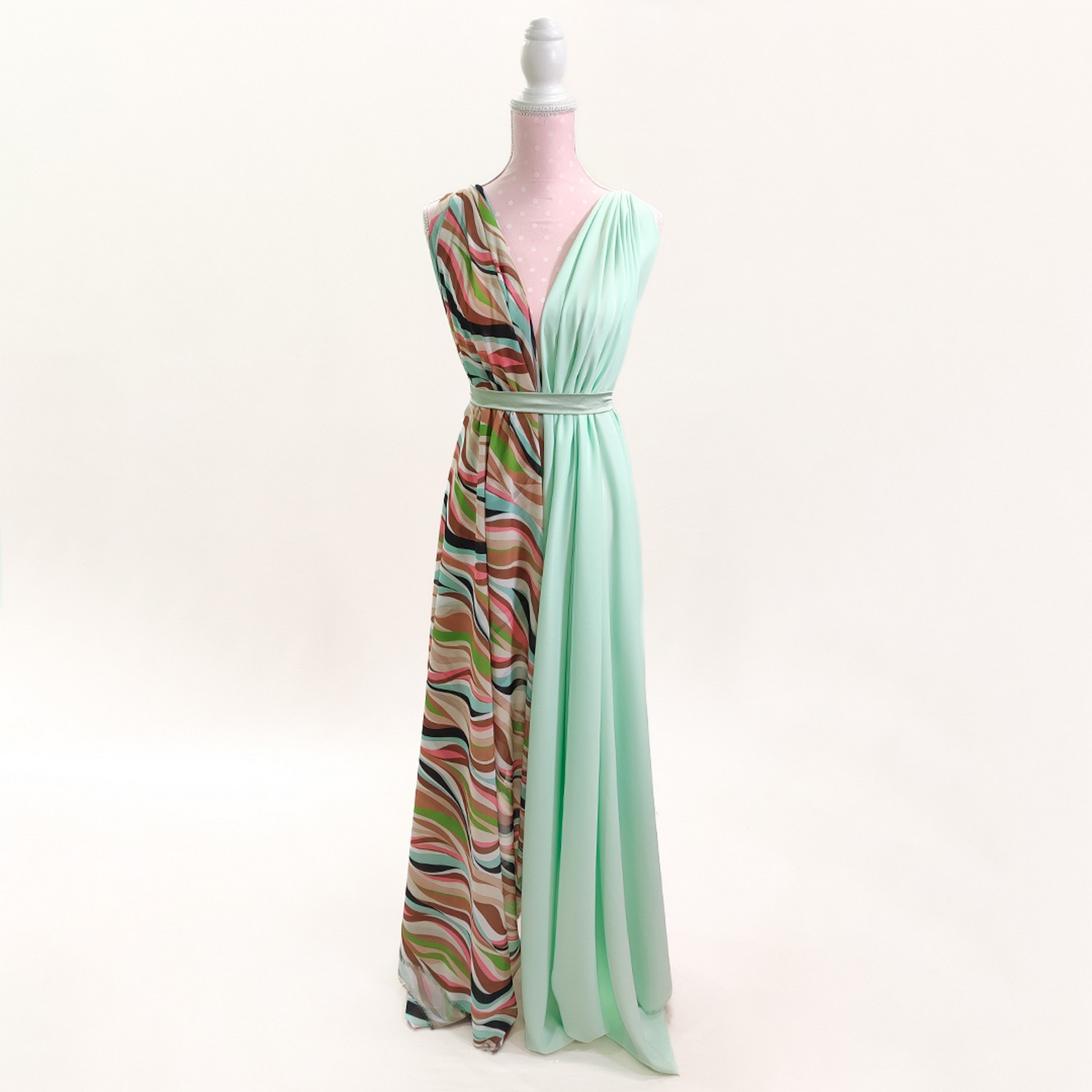Tessuto Georgette a fantasia motivo astratto acquamarina – biscotto abbinato a tessuto crepe tinta unita verdino