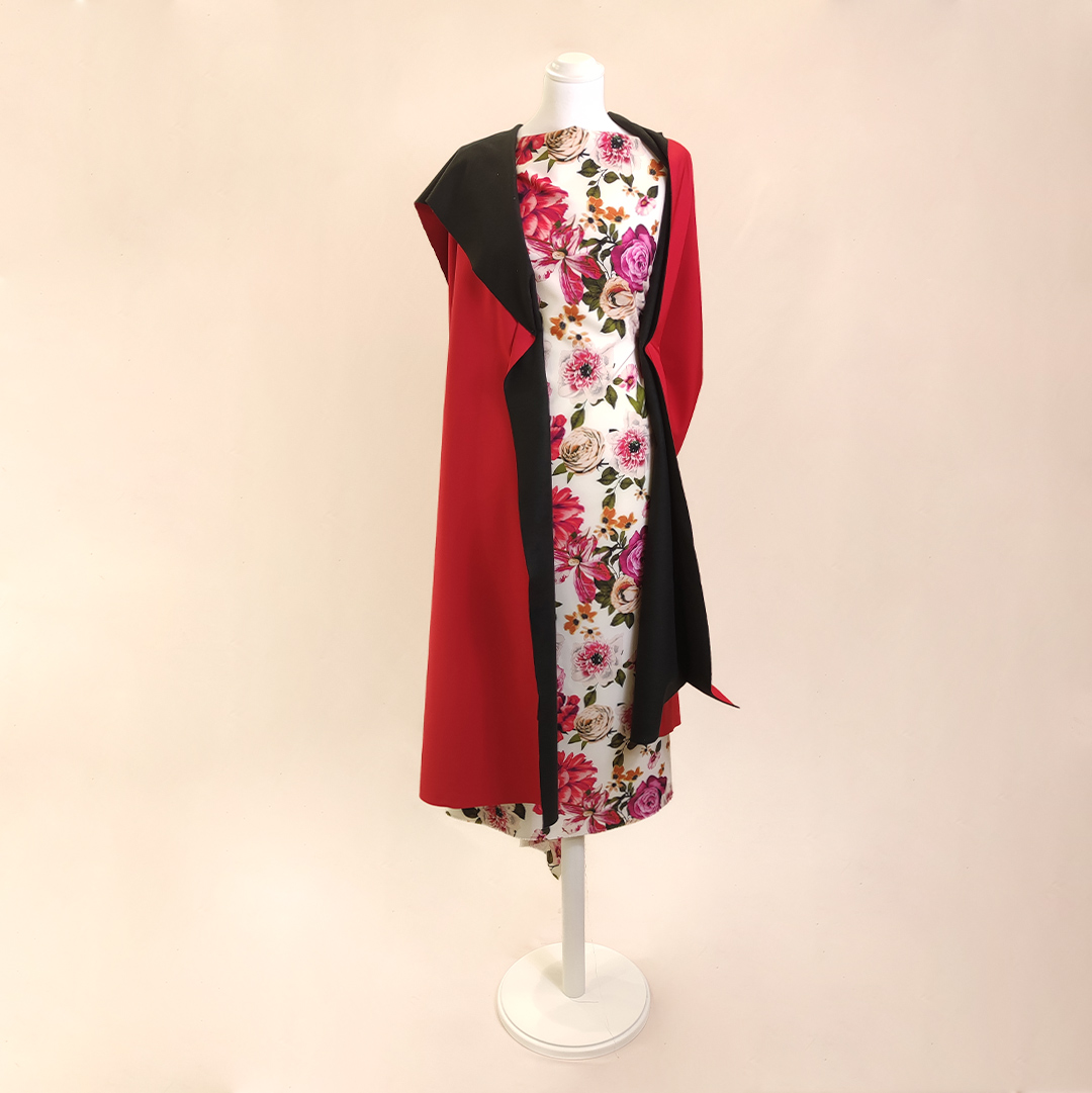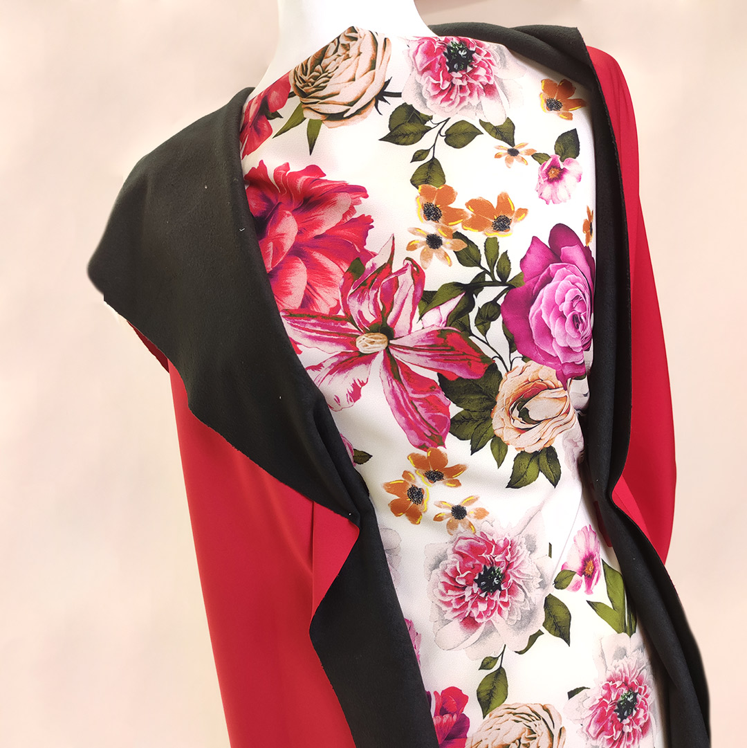 Tessuto Neoprene doppiato abbinato a tessuto Cady Elasticizzato a fantasia.