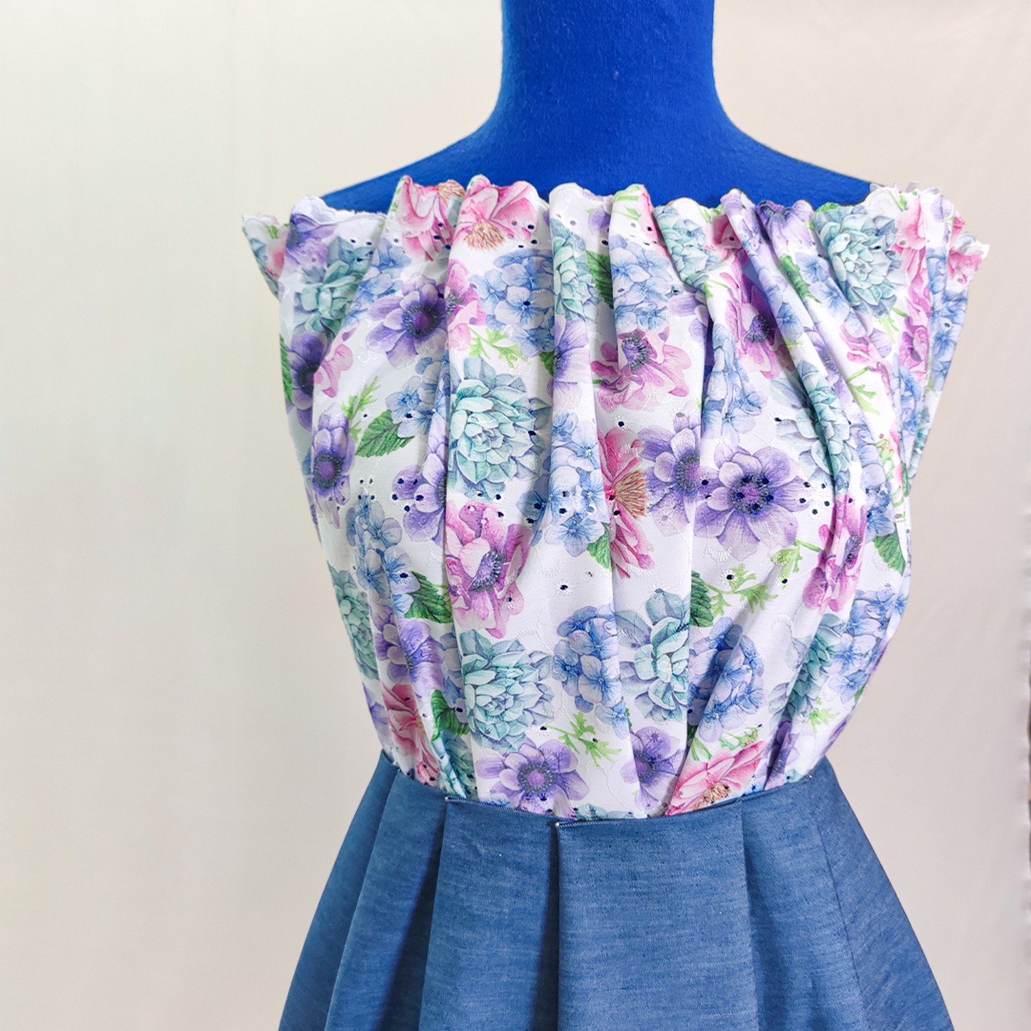 Tessuto Sangallo a fantasia abbinato a Tessuto Jeans Chambray Denim.