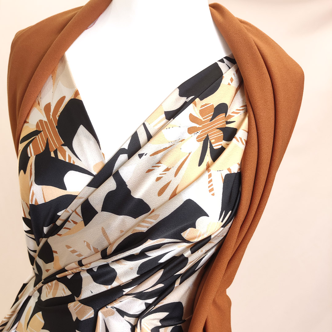Tessuto Satin a Fantasia abbinato a Tessuto Scuba Crepe tinta unita.