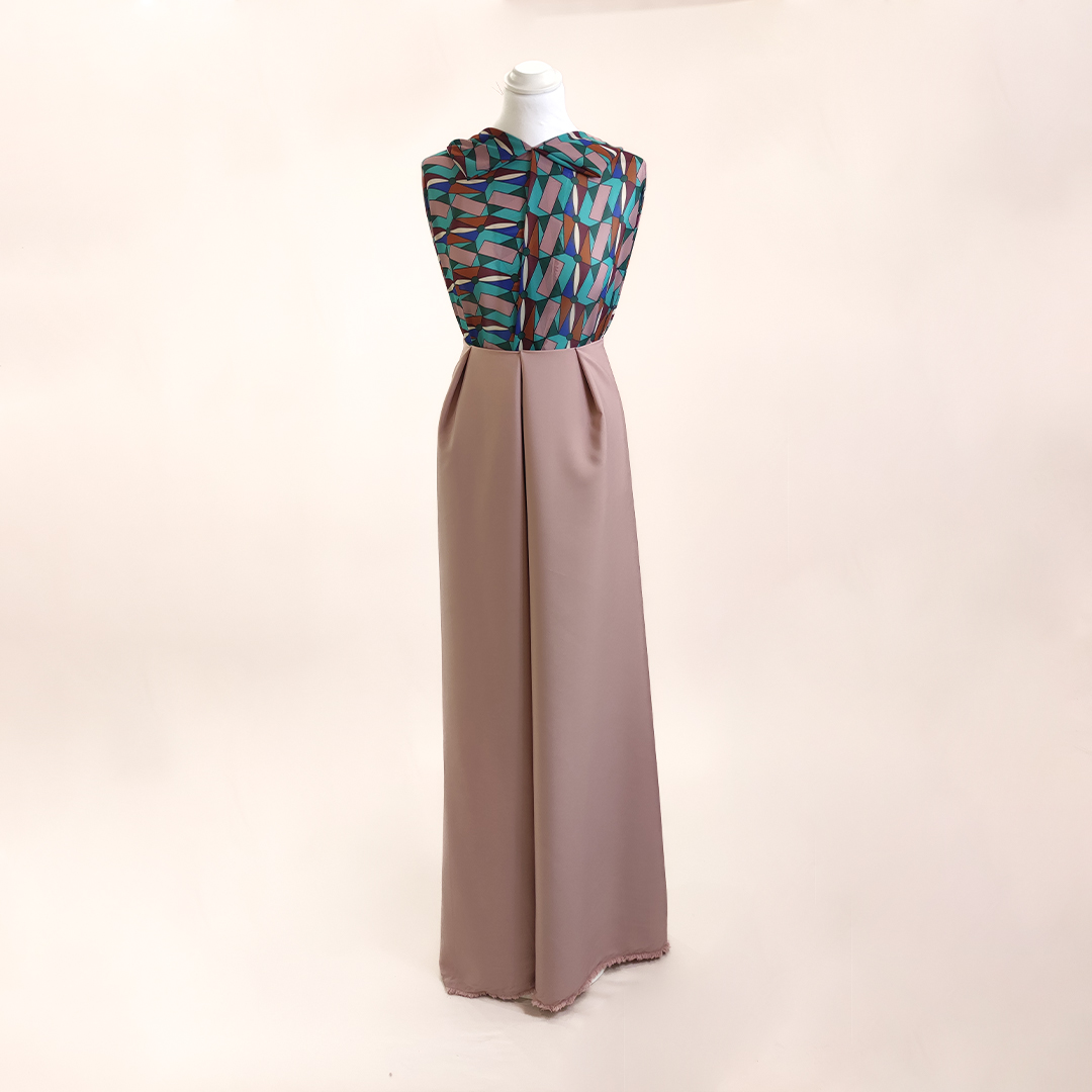 Tessuto Satin a fantasia motivo geometrico abbinato a Tessuto Cady elasticizzato in tinta unita rosa cipria.