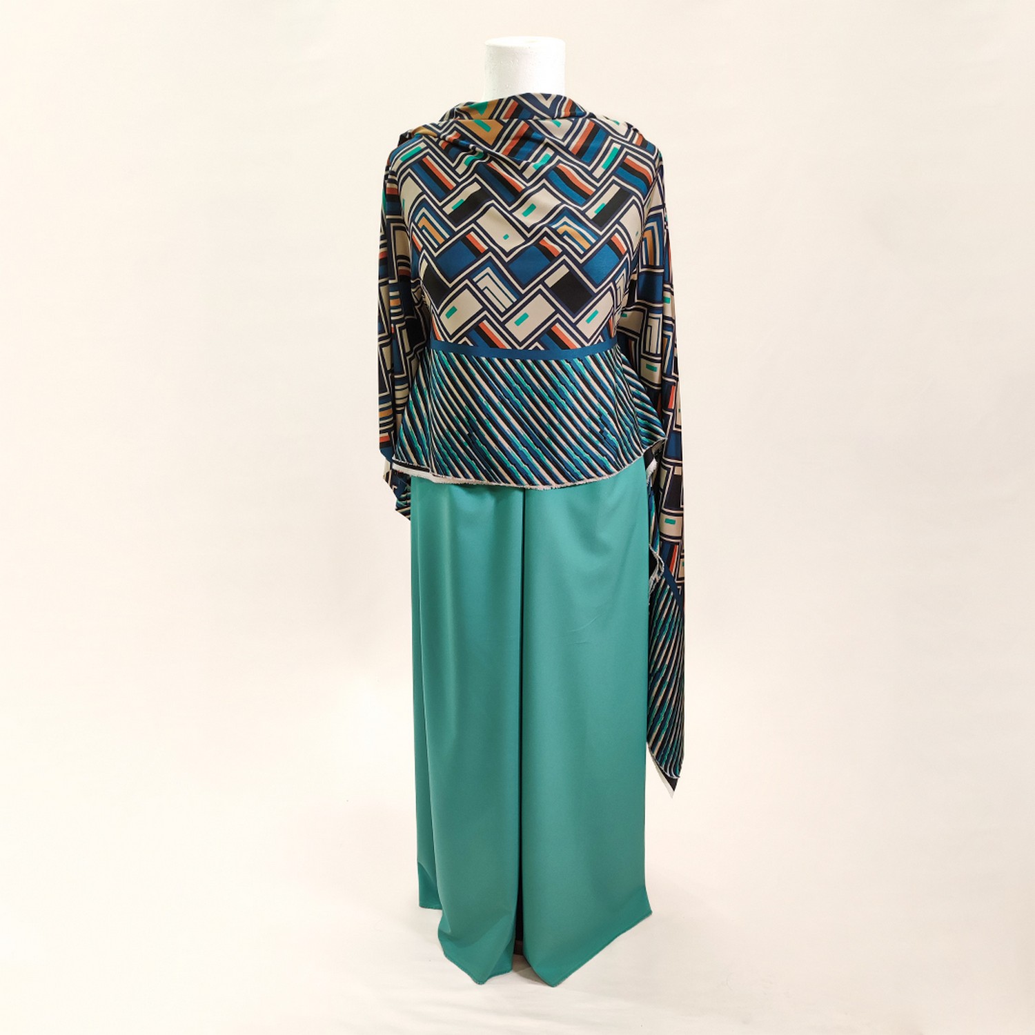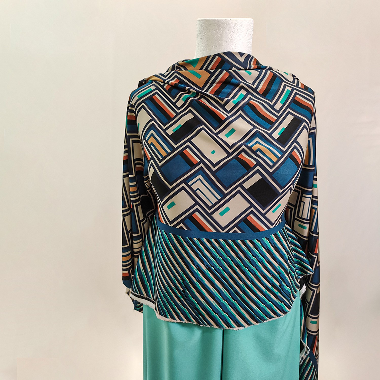 Tessuto Satin a fantasia motivo geometrico abbinato a tessuto crepe tinta unita tiffany.