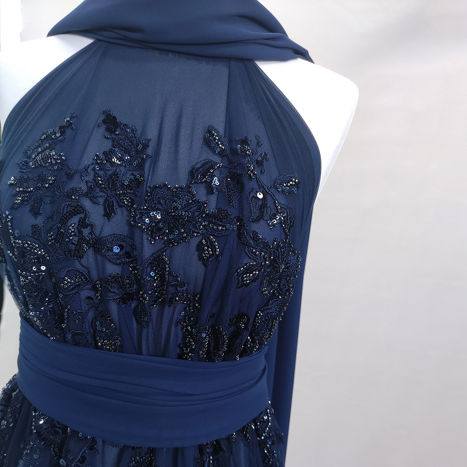 Tessuto tulle mano seta ricamato con pietre e con paillettes motivo floreale blu notte abbinato a Tessuto Chiffon blu notte.