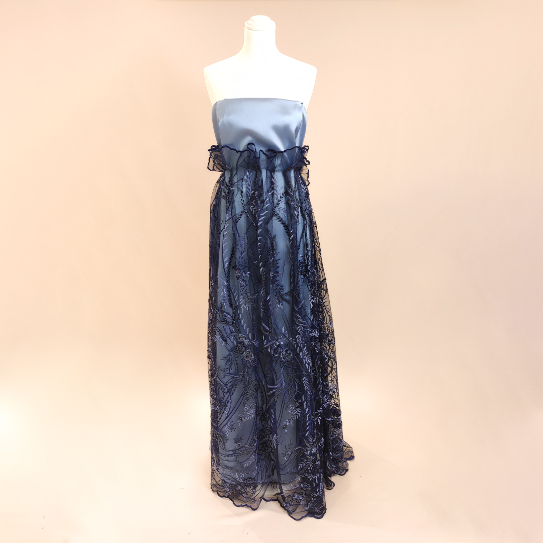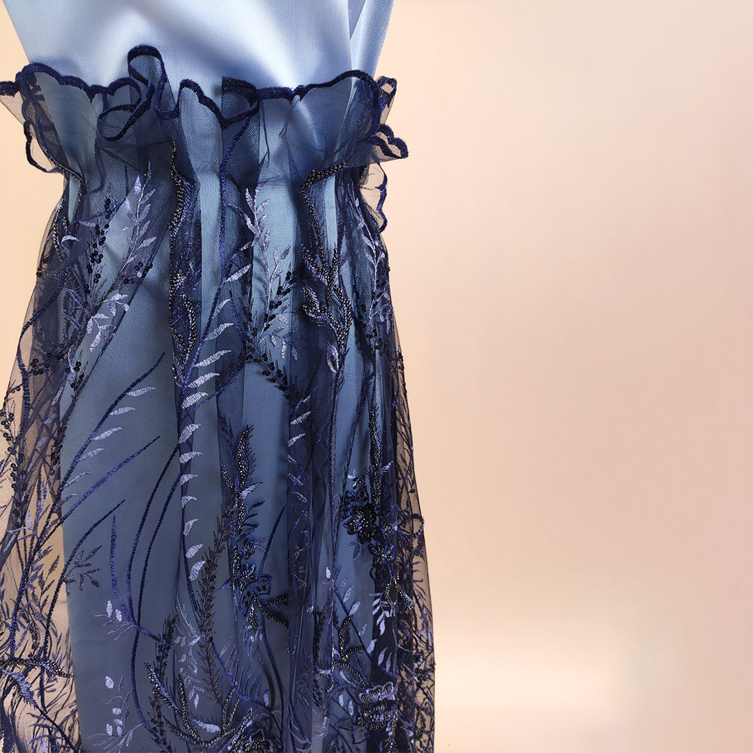Tessuto Tulle – Pizzo ricamato motivo floreale abbinato a Tessuto Mikado in tinta unita carta da zucchero.