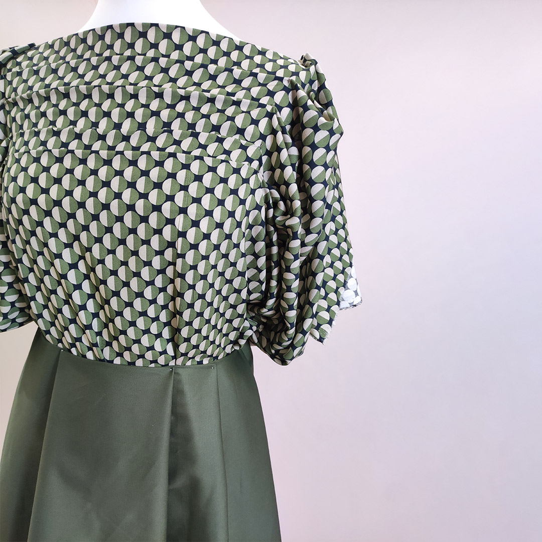 Tessuto Viscosa a fantasia motivo pois abbinato a Tessuto Gabardine in cotone in tinta unita verde militare