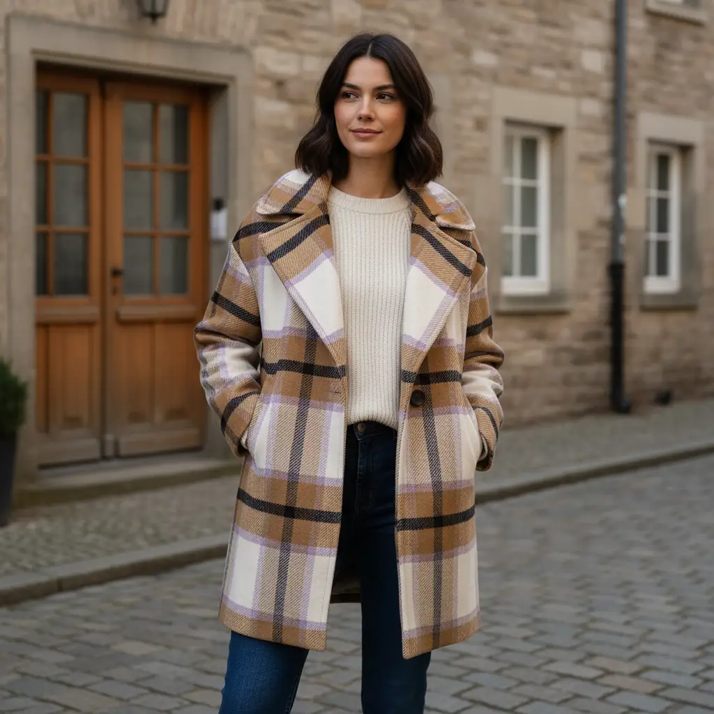 Tessuto per cappotto motivo quadri bianco – cammello – lilla – nero