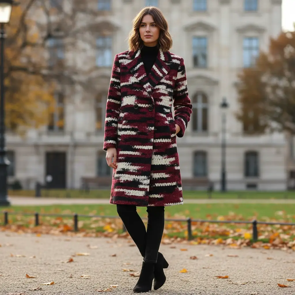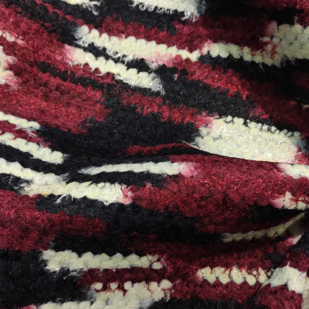 Tessuto per cappotto motivo tweed bordeaux – nero – panna