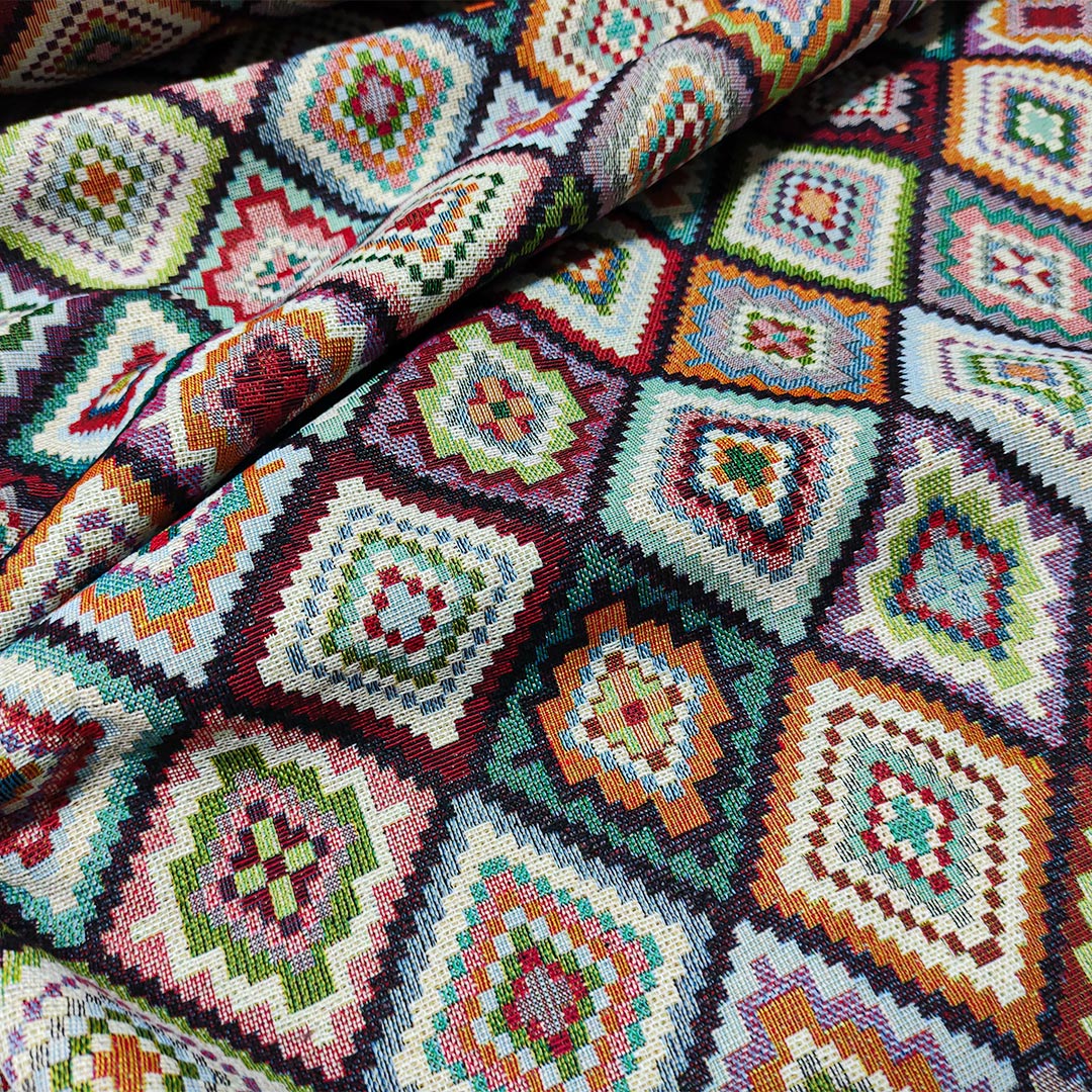 Tessuto per arredo Gobelin a fantasia dalla mano resistente e sostenuta, si presta alla creazione di complementi d’arredo colorati e vivaci come: runner, cuscini, copri tavolo e rivestimenti di divani e poltrone, inoltre è particolarmente utilizzato per realizzare borse.