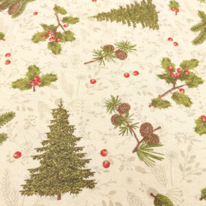 €7,00Il prezzo originale era: €7,00.€5,00Il prezzo attuale è: €5,00. al metroTessuto Misto Cotone decorativo natalizio lurex motivo alberi e bacche oro – beige – verde – rosso