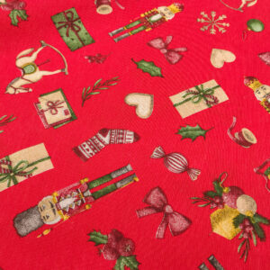 €7,00Il prezzo originale era: €7,00.€5,00Il prezzo attuale è: €5,00. al metroTessuto Misto Cotone decorativo natalizio motivo schiaccianoci rosso – verde – giallo