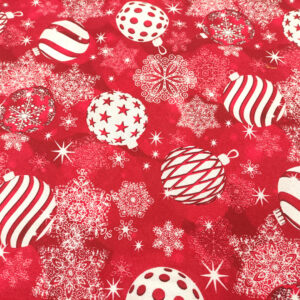 €7,00Il prezzo originale era: €7,00.€5,00Il prezzo attuale è: €5,00. al metroTessuto Misto Cotone decorativo natalizio motivo sfere rosso – bianco