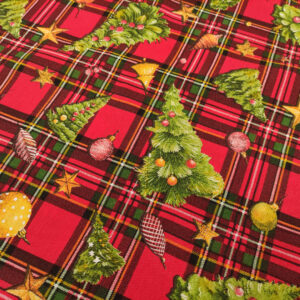 €12,00Il prezzo originale era: €12,00.€7,90Il prezzo attuale è: €7,90. al metroTessuto Misto Cotone decorativo natalizio motivo tartan ed alberi rosso – verde – giallo