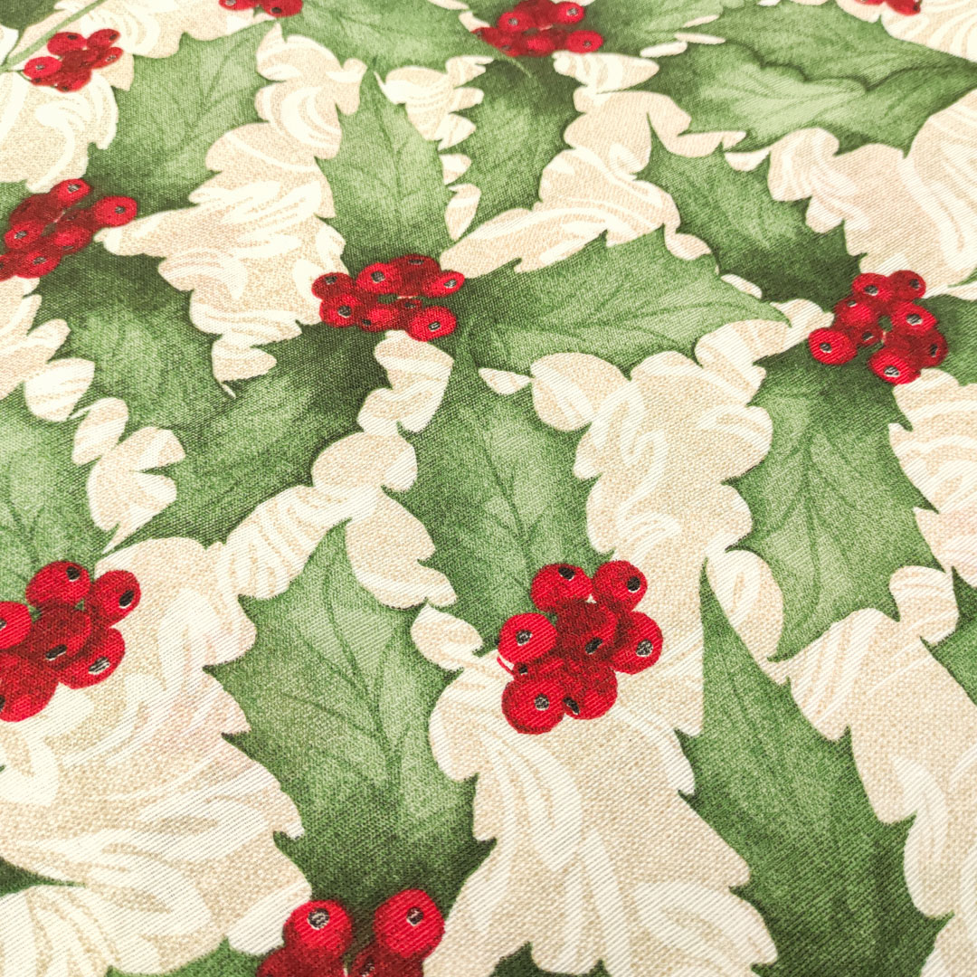 Tessuto Misto Cotone decorativo natalizio motivo vischio beige – rosso – verde