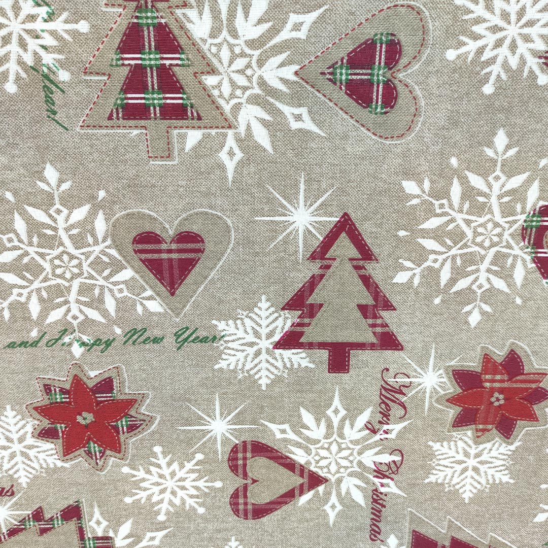 Tessuto Misto Cotone per arredo natalizio a fantasia con alberi e stelle rosso – tortora – bordeaux