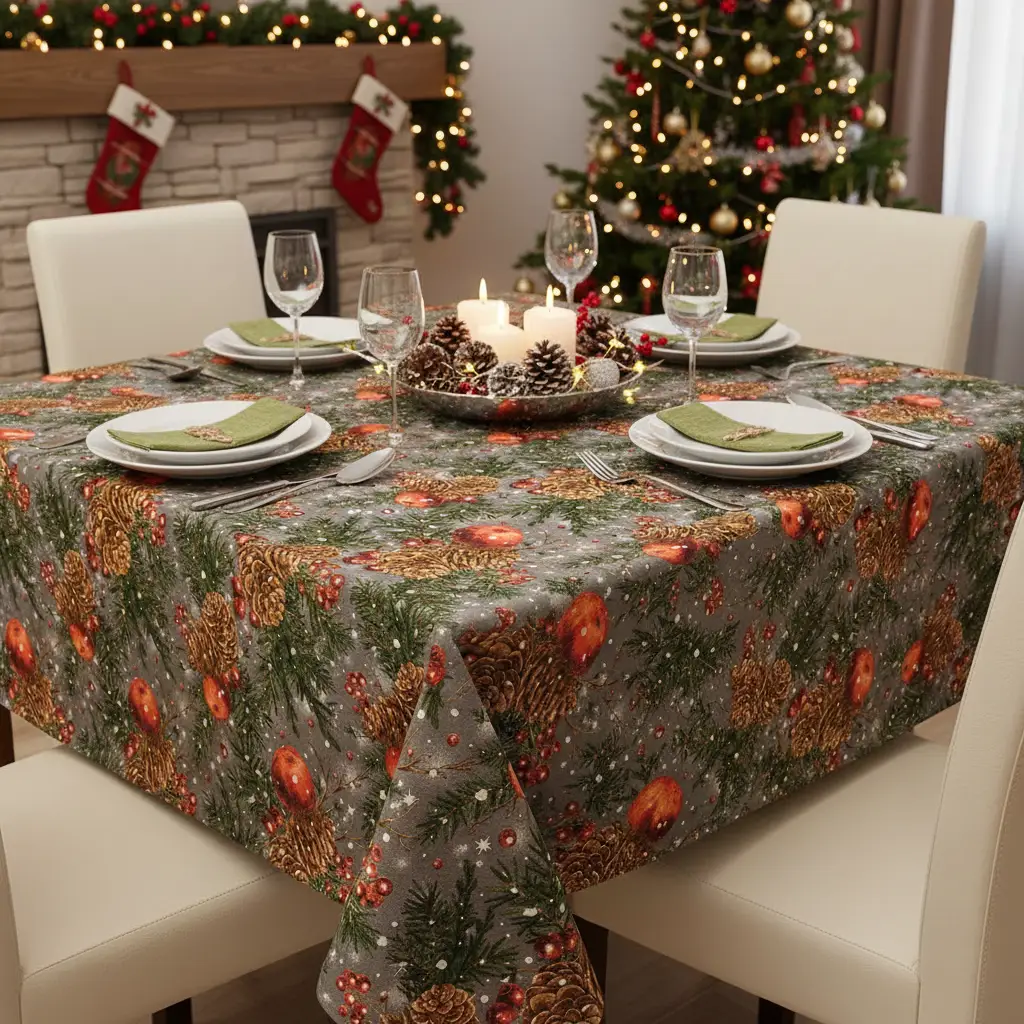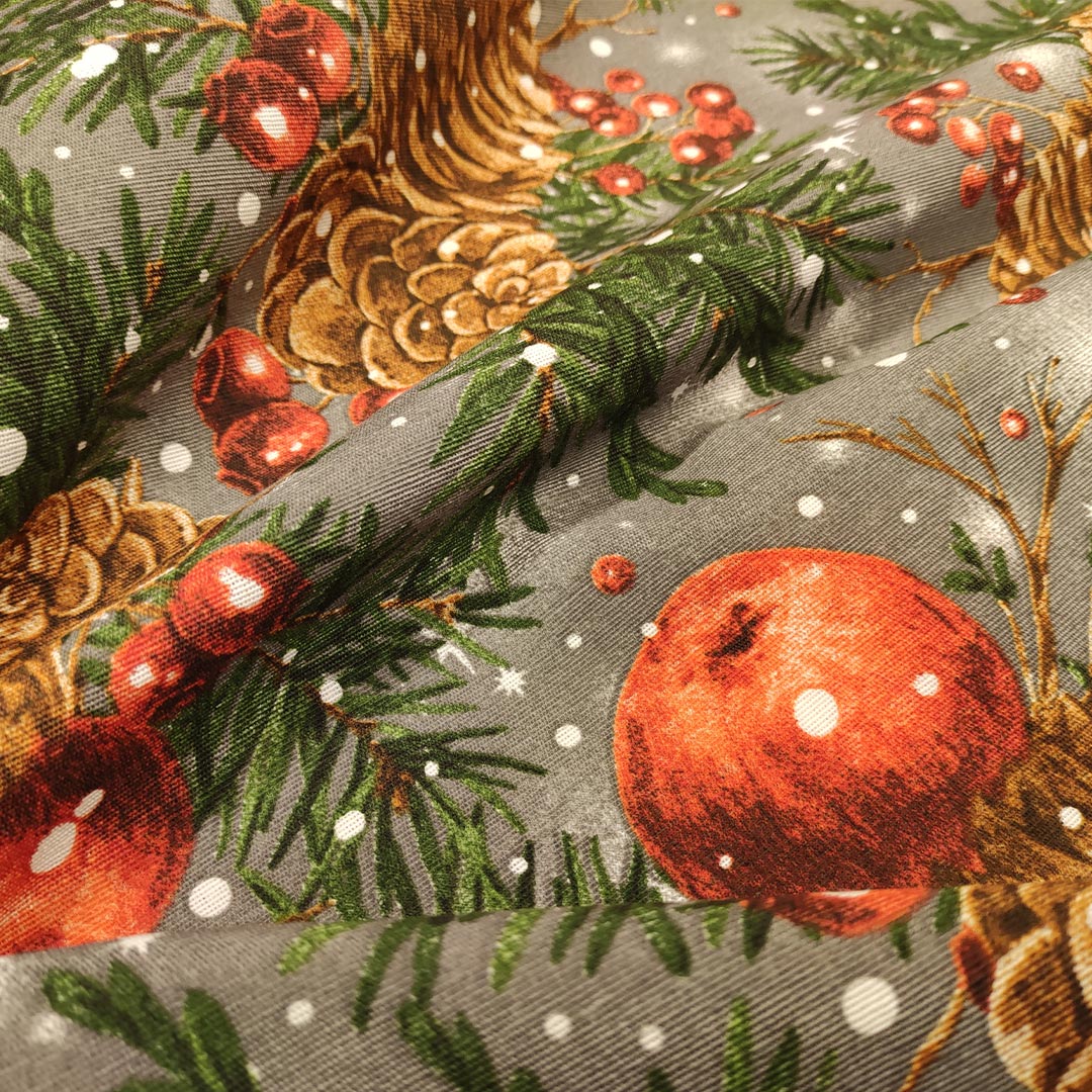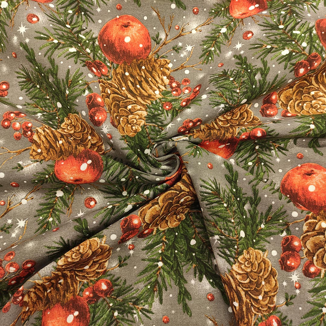 Tessuto Misto Cotone per arredo natalizio a fantasia con vischio e pigne grigio – verde – arancio