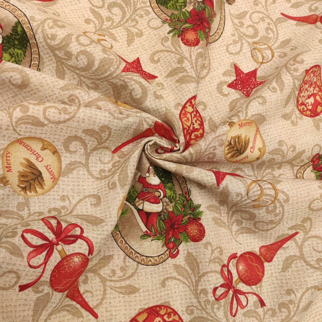 Tessuto Natalizio Decorativo a fantasia misto cotone con Babbo Natale beige – rosso – verde