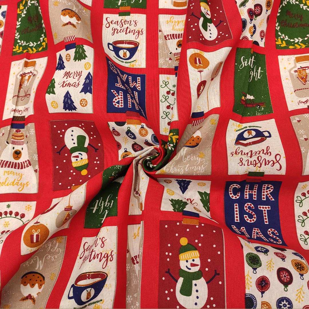 Tessuto Natalizio Decorativo a fantasia misto cotone con cartoline rosso – verde – bianco