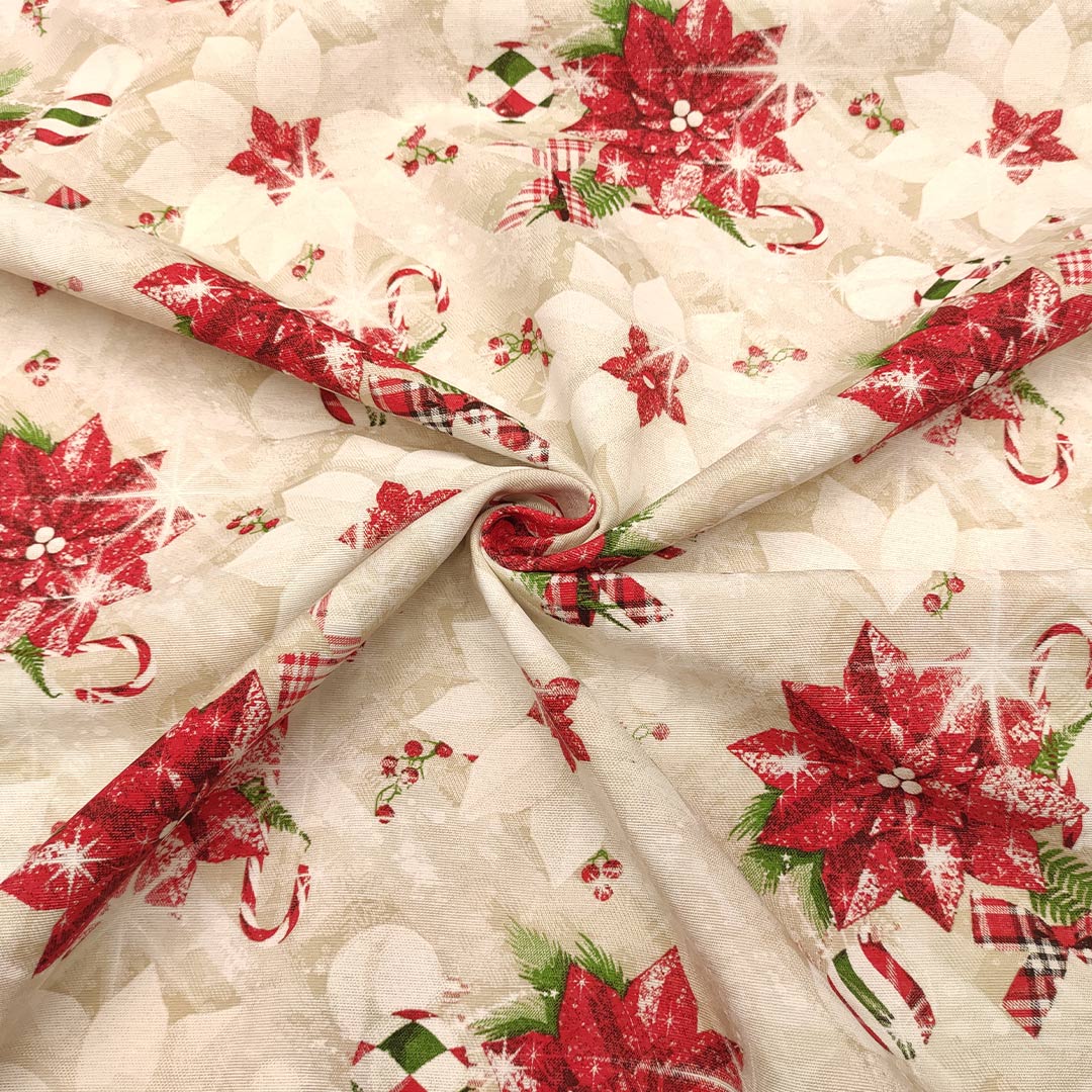 Tessuto Natalizio Decorativo a fantasia misto cotone con rosa di Natale beige – rosso – verde