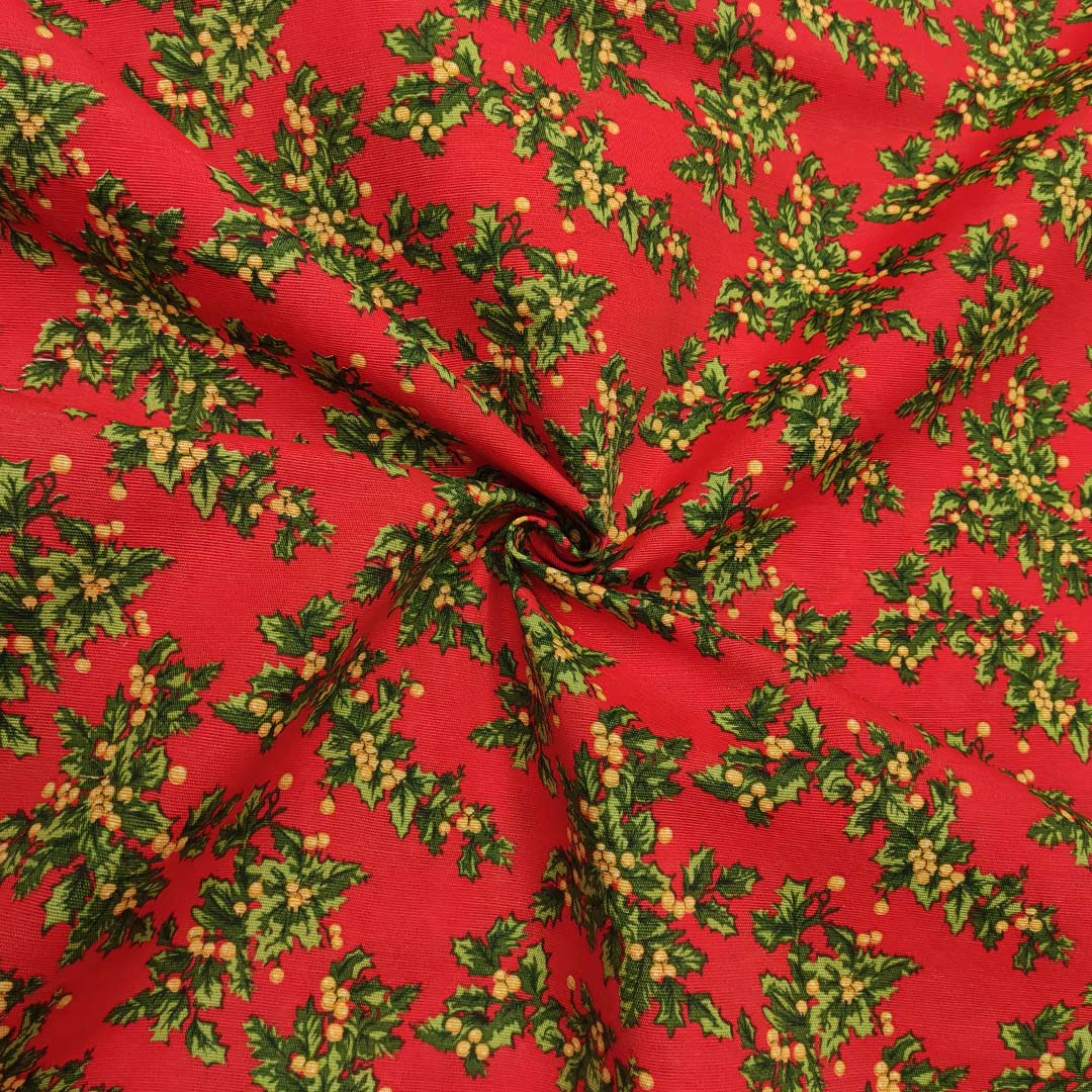 Tessuto Natalizio Decorativo a fantasia misto cotone con vischio rosso – verde