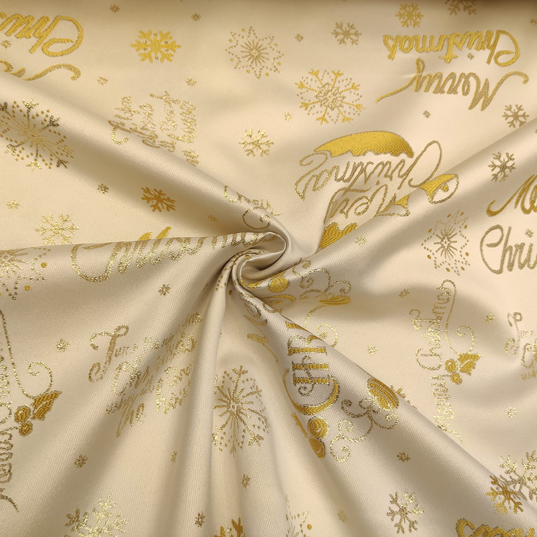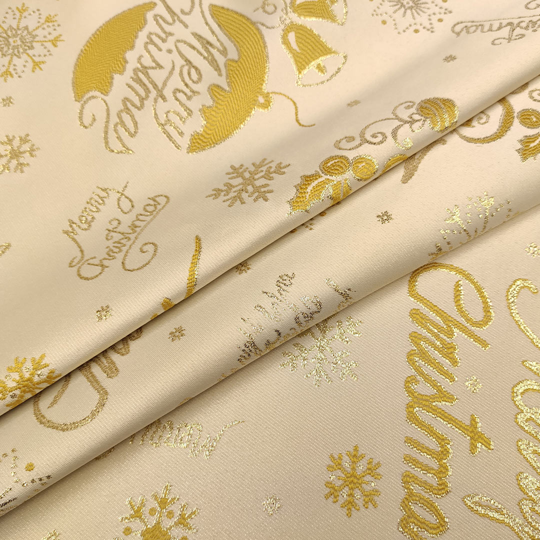 Tessuto Natalizio decorativo raso con fiocchi di neve oro – panna