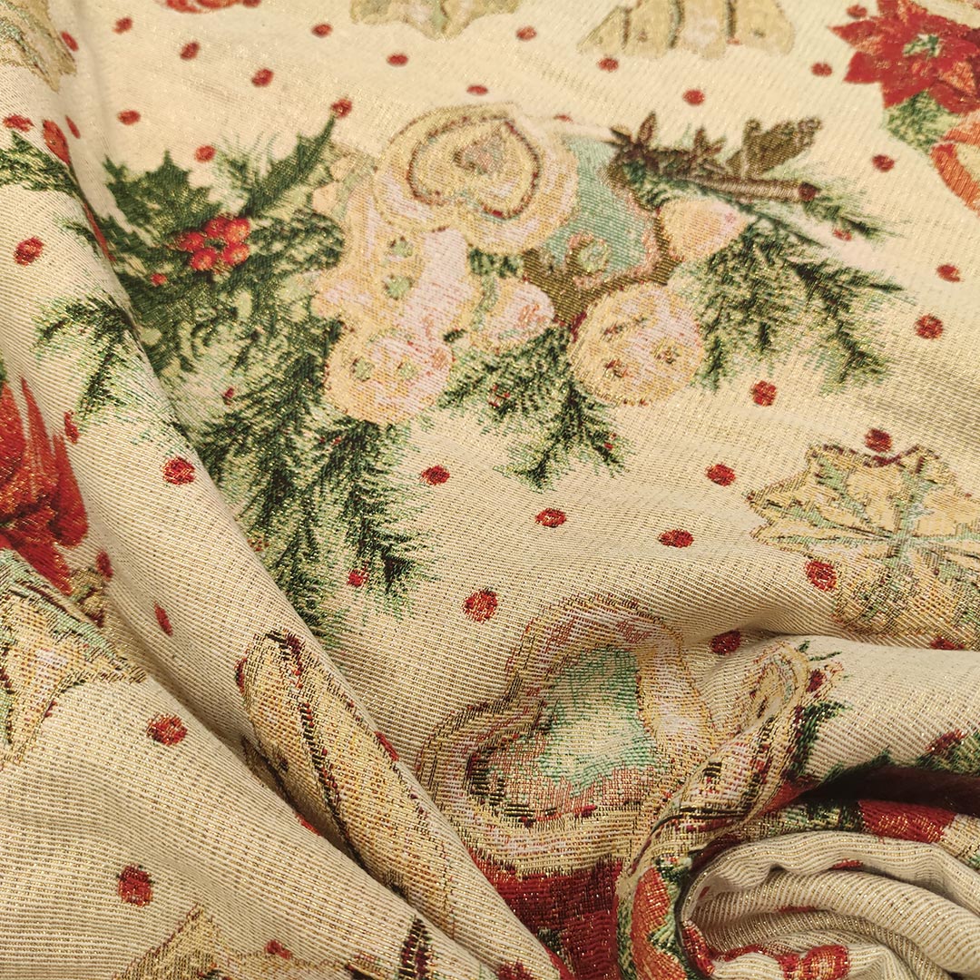 Tessuto per arredo Gobelin lurex natalizio a fantasia ideale per arredare la vostra casa in occasione delle festività natalizie, dalla mano resistente e sostenuta, si presta alla creazione di complementi d’arredo colorati e vivaci come: runner, cuscini, copri tavolo e rivestimenti di divani e poltrone, inoltre è particolarmente utilizzato per il cucito creativo.
