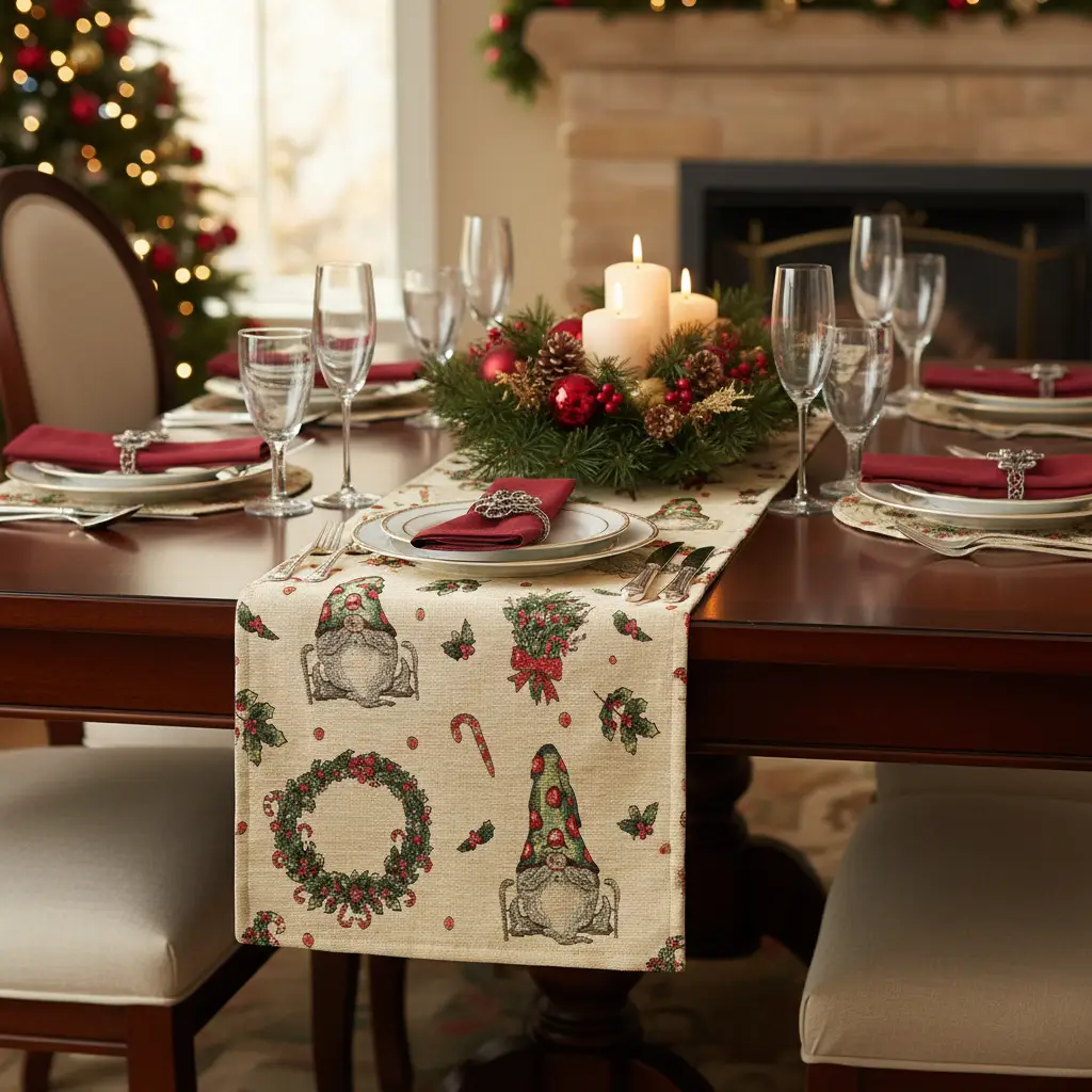 Tessuto per arredo Gobelin natalizio lurex motivo gnomi e ghirlande beige – oro – rosso – verde