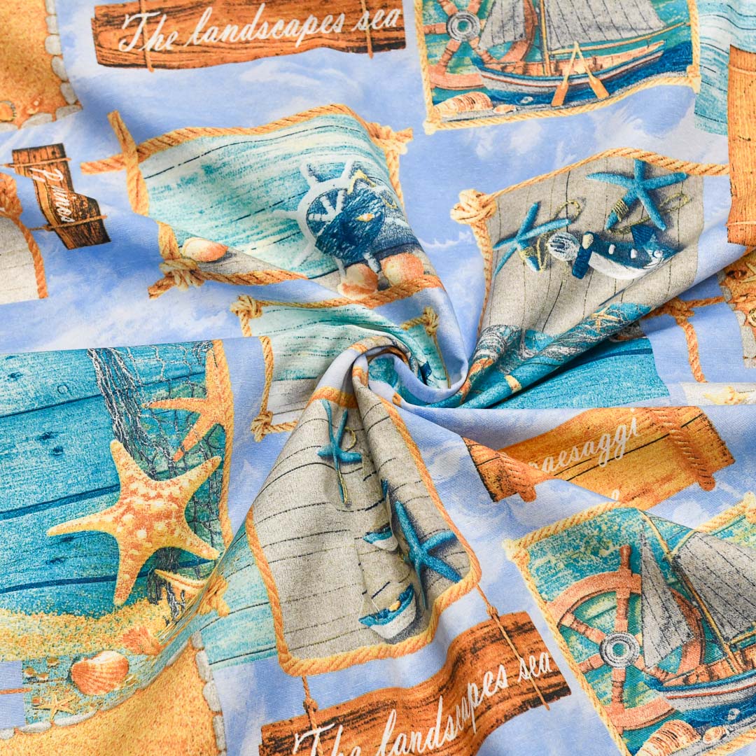Tessuto Misto Cotone per arredamento a fantasia motivo marino celeste – beige