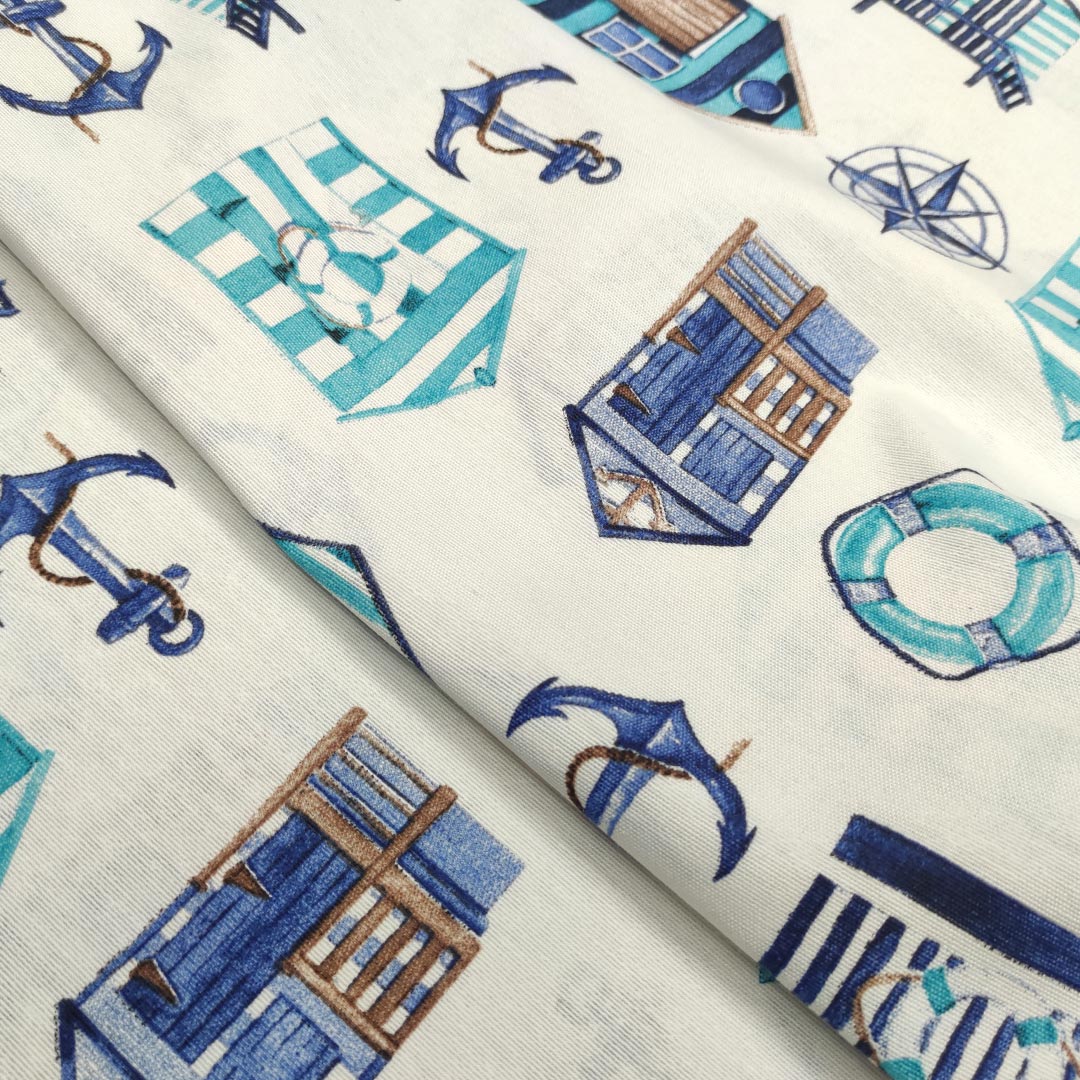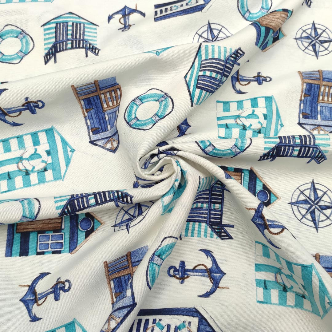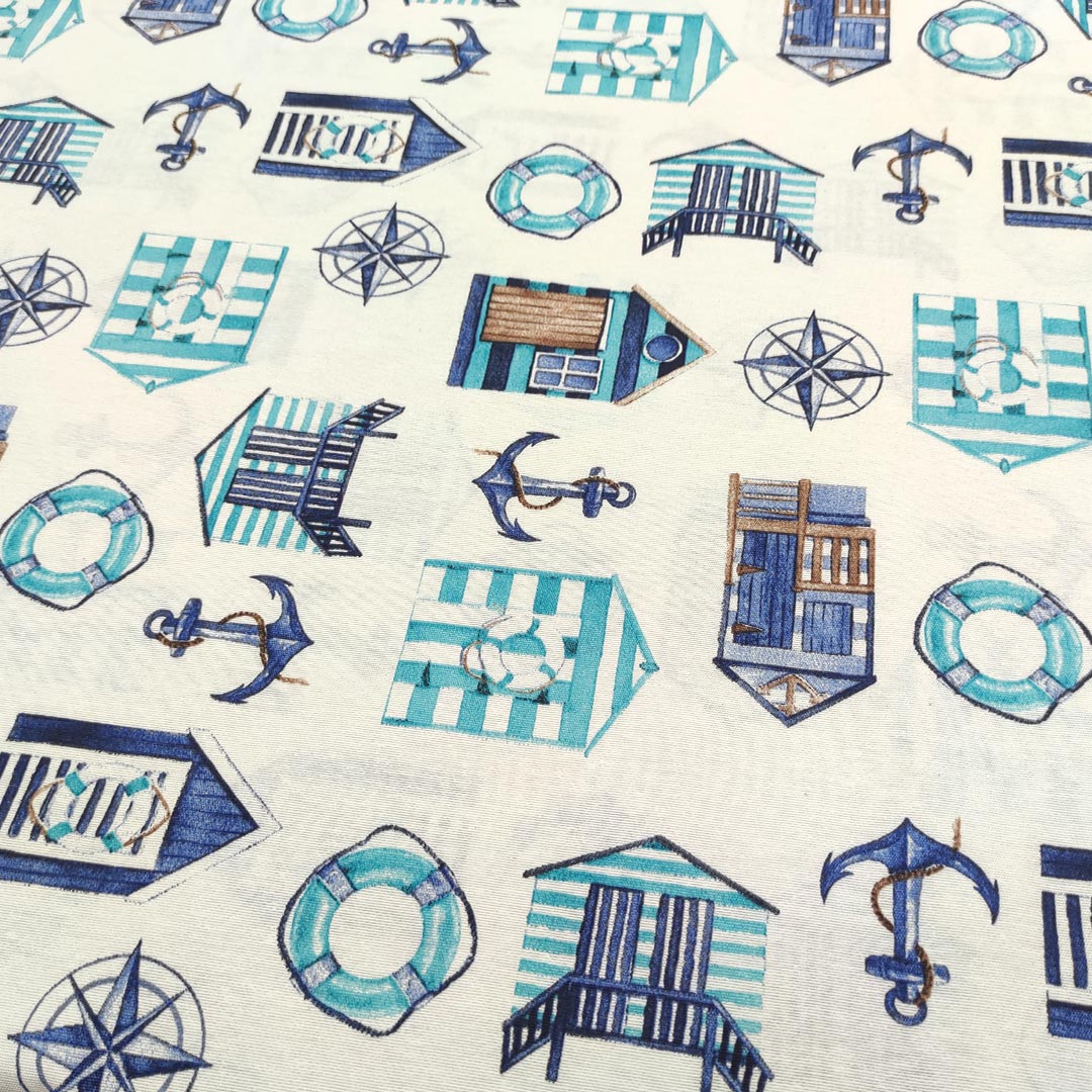 Tessuto Misto Cotone per arredo a fantasia motivo marino bianco – blu – turchese