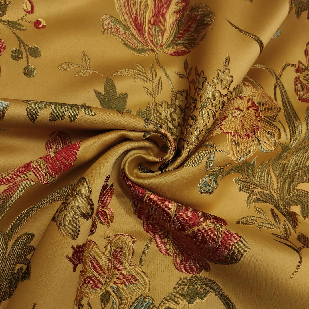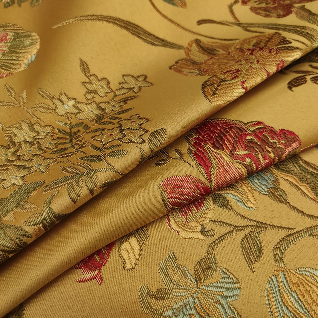 Tessuto Raso Damascato per Arredamento motivo floreale oro – celeste – verde