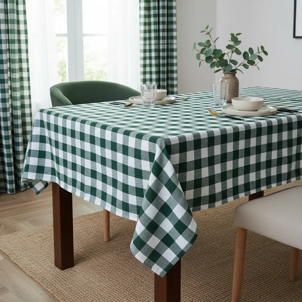 Tessuto Cotone per tovagliato tinto in filo motivo quadro grande bianco – verde bottiglia