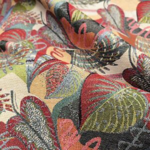 Tessuto per arredo Gobelin a fantasia motivo floreale beige – verde acido – rosso