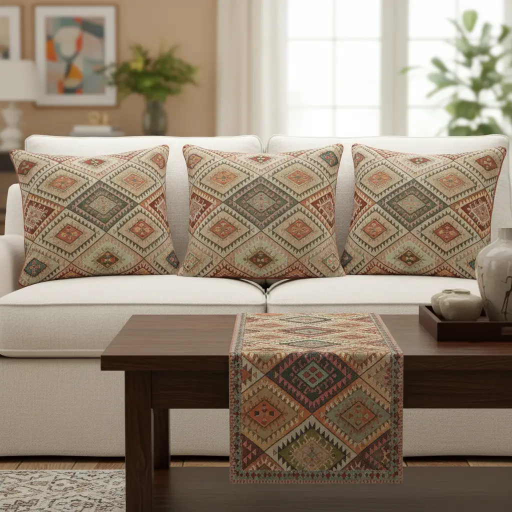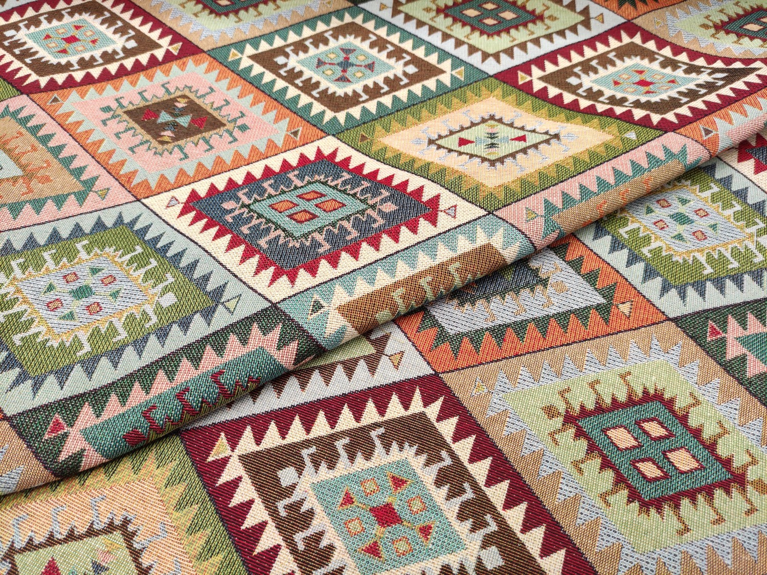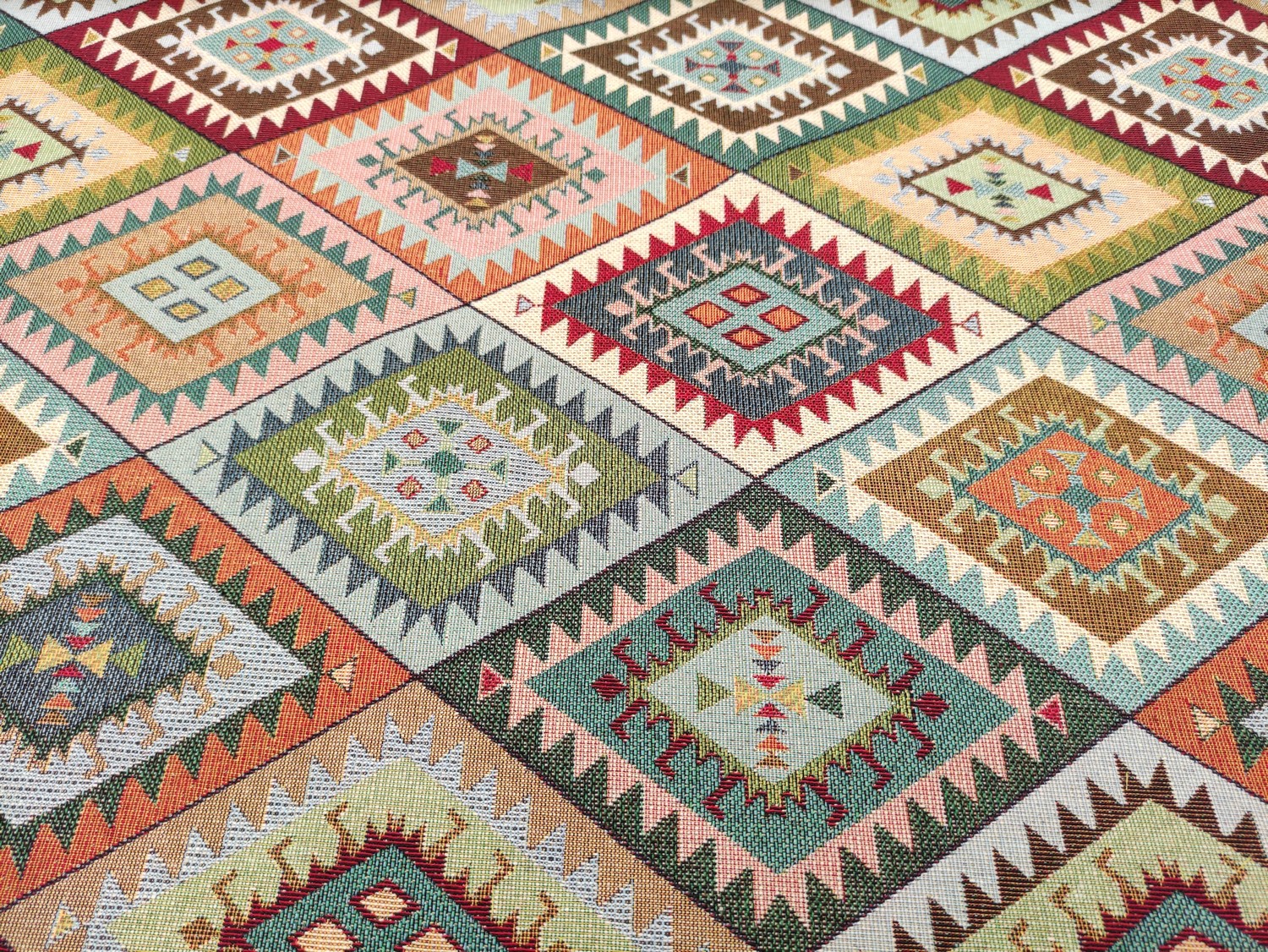 Tessuto Gobelin a fantasia motivo etnico beige – arancione – verde – rosso