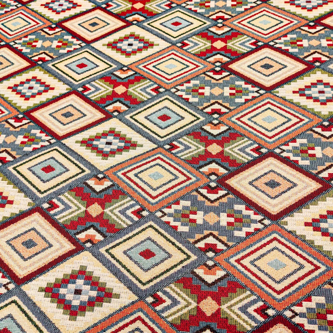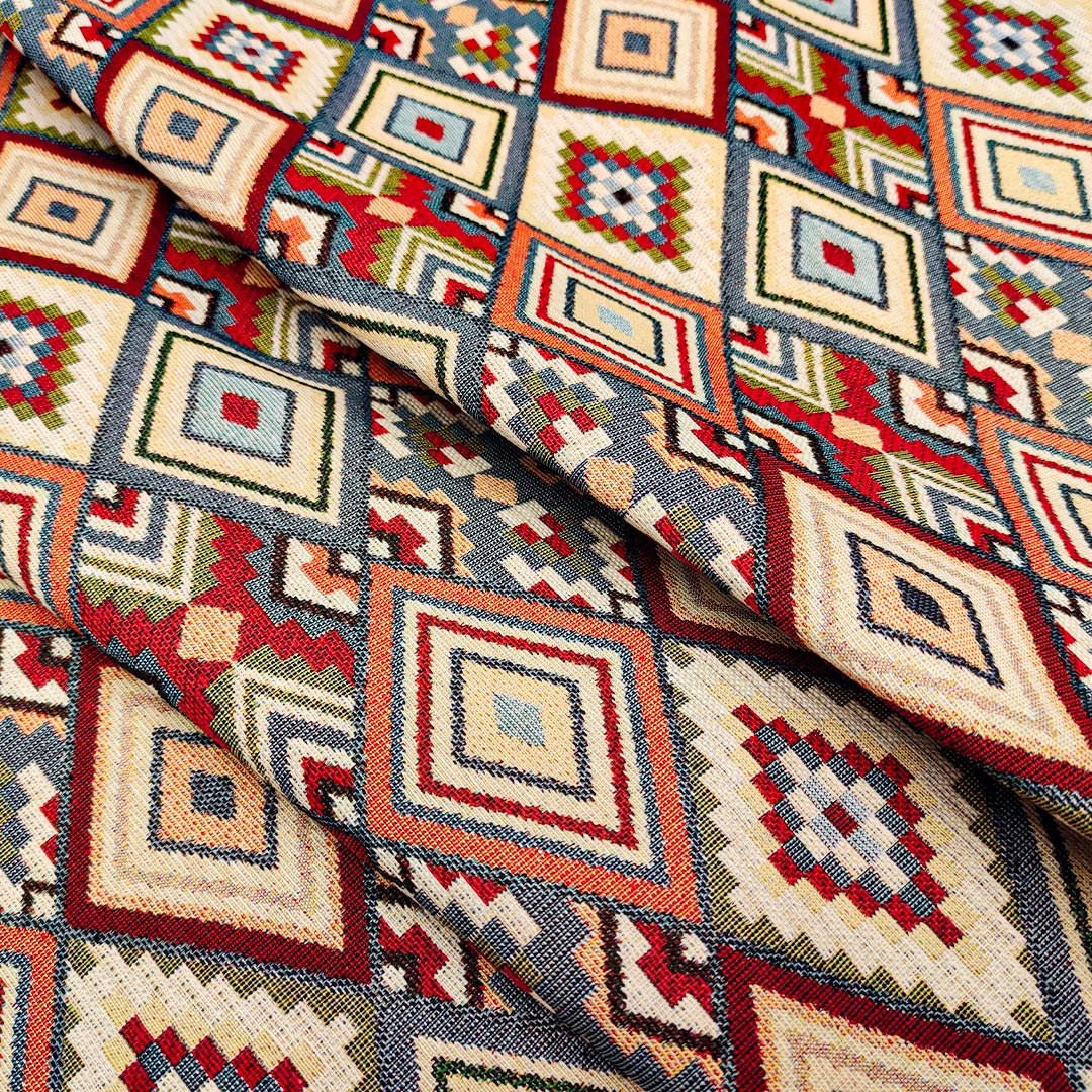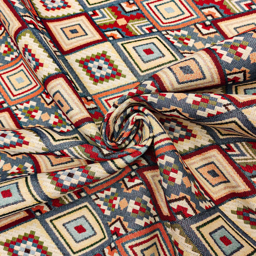 Tessuto per arredo Gobelin a fantasia dalla mano resistente e sostenuta, si presta alla creazione di complementi d’arredo colorati e vivaci come: runner, cuscini, copri tavolo e rivestimenti di divani e poltrone, inoltre è particolarmente utilizzato per realizzare borse e oggettistica.