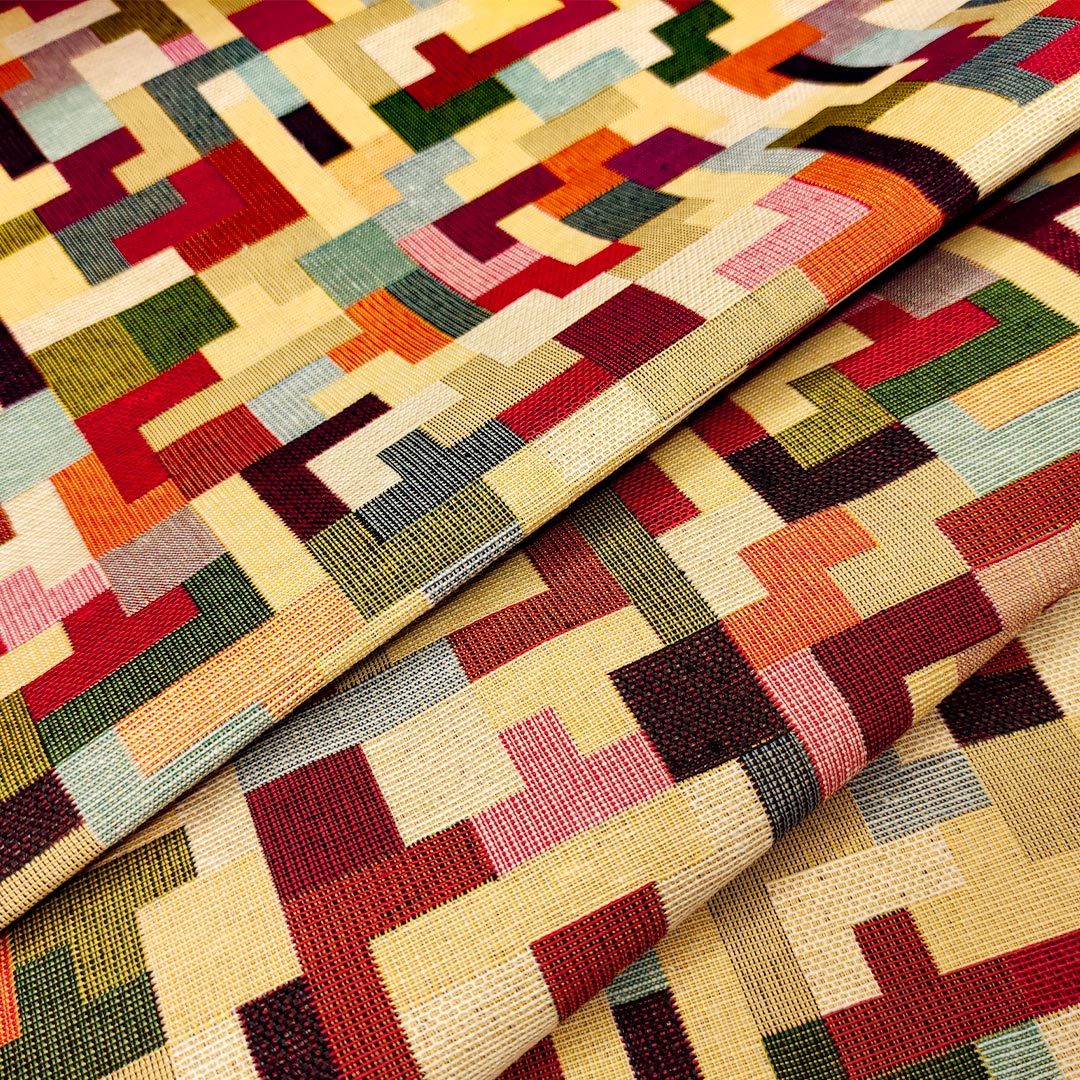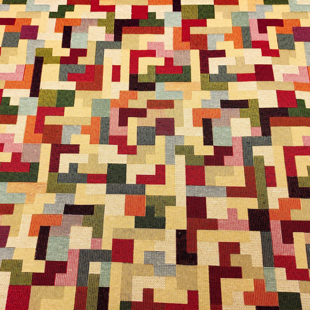 Tessuto per arredo Gobelin a fantasia motivo geometrico beige – arancio – verde – bordeaux