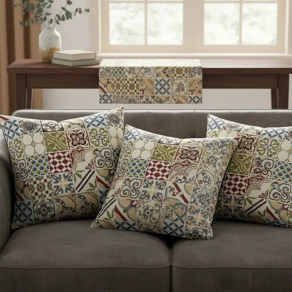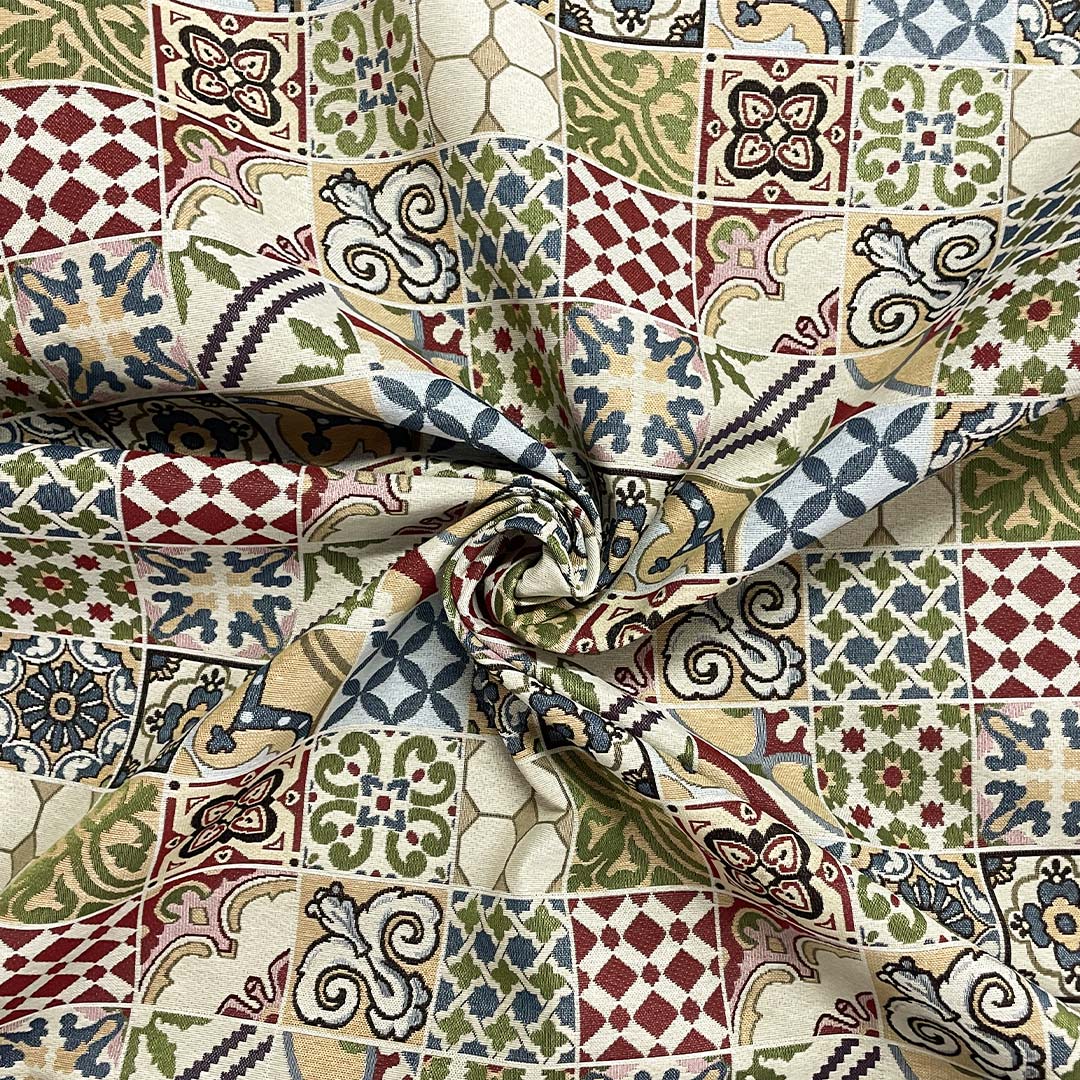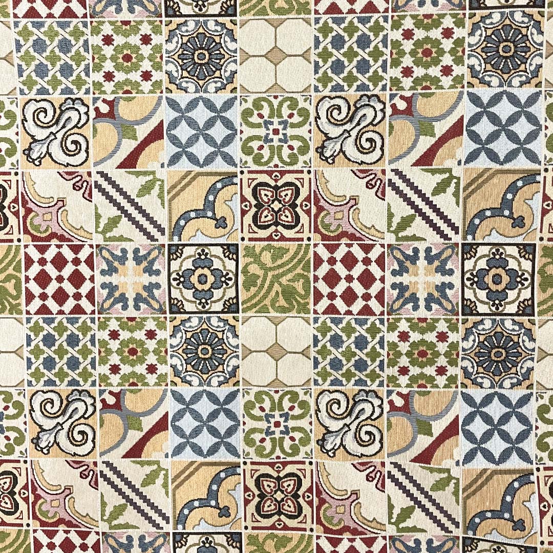 Tessuto per arredo Gobelin a fantasia motivo maiolica beige – verde acido – azzurro – bordeaux – arancio