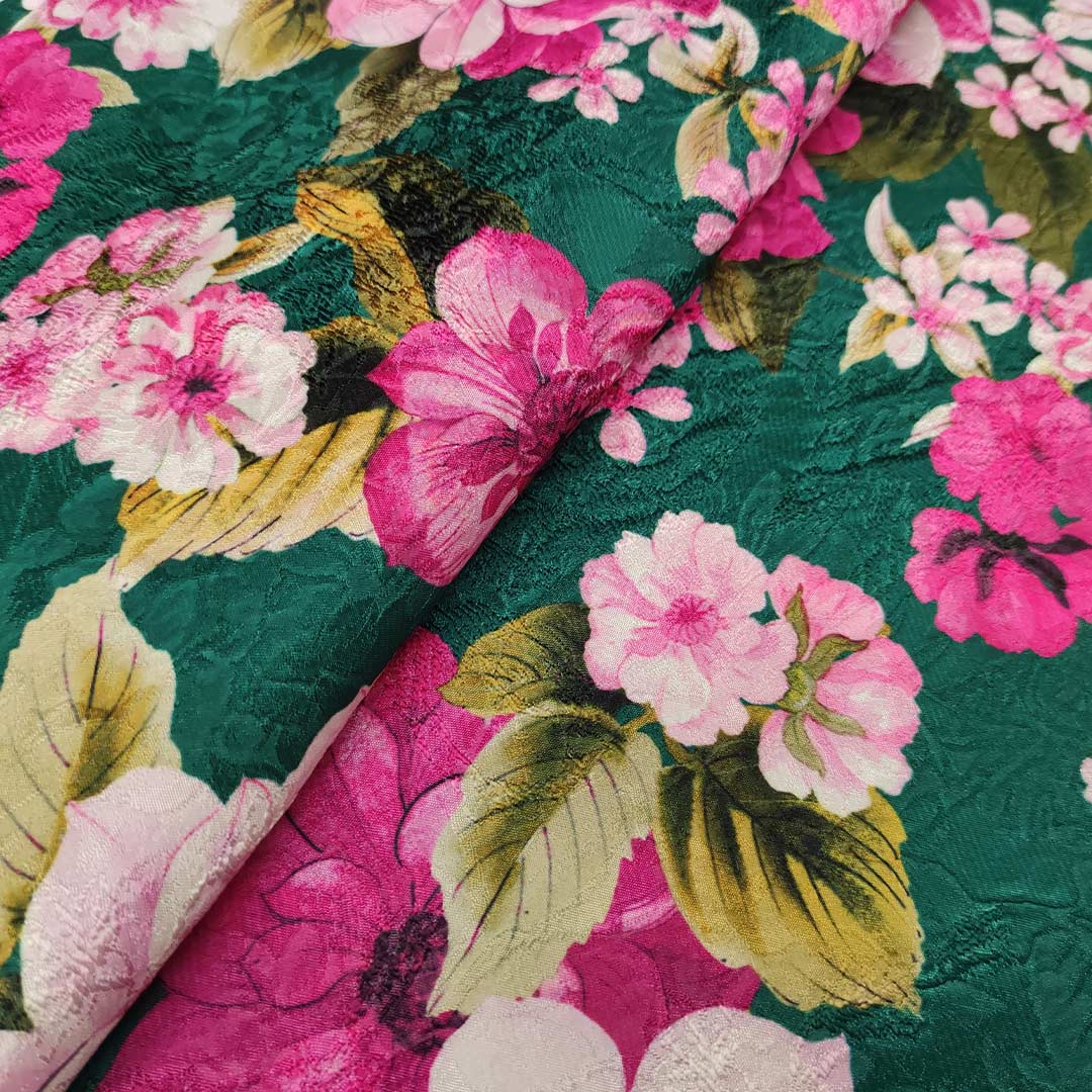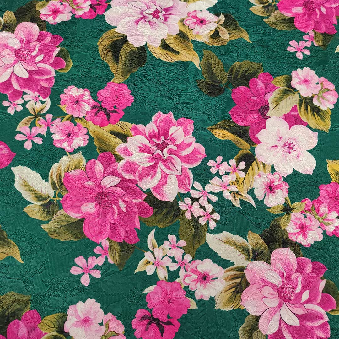 Tessuto Broccato in cotone a fantasia motivo floreale verde bottiglia – fucsia – rosa – verde acido