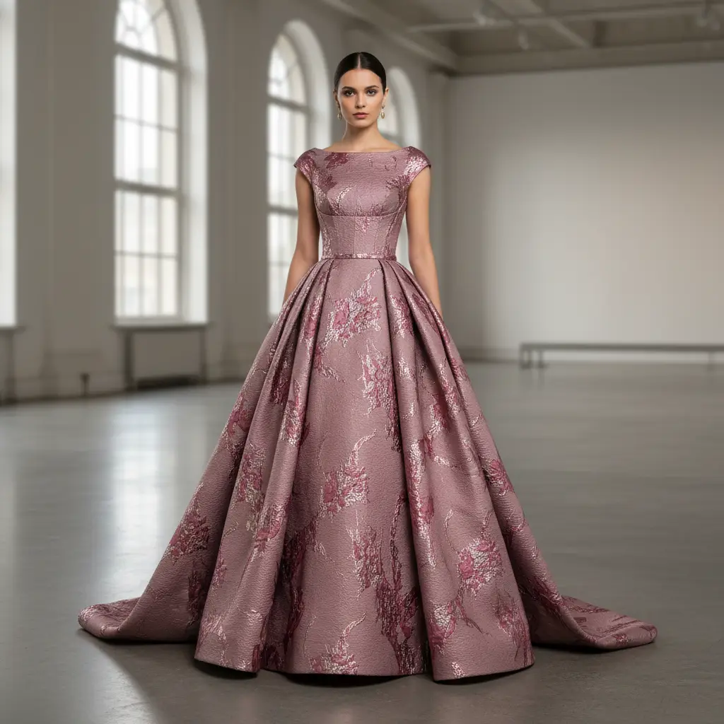 Tessuto Broccato in seta ideale per realizzare capi eleganti e strutturati, si presta alla creazione di abiti ampi, giacche e gonne.