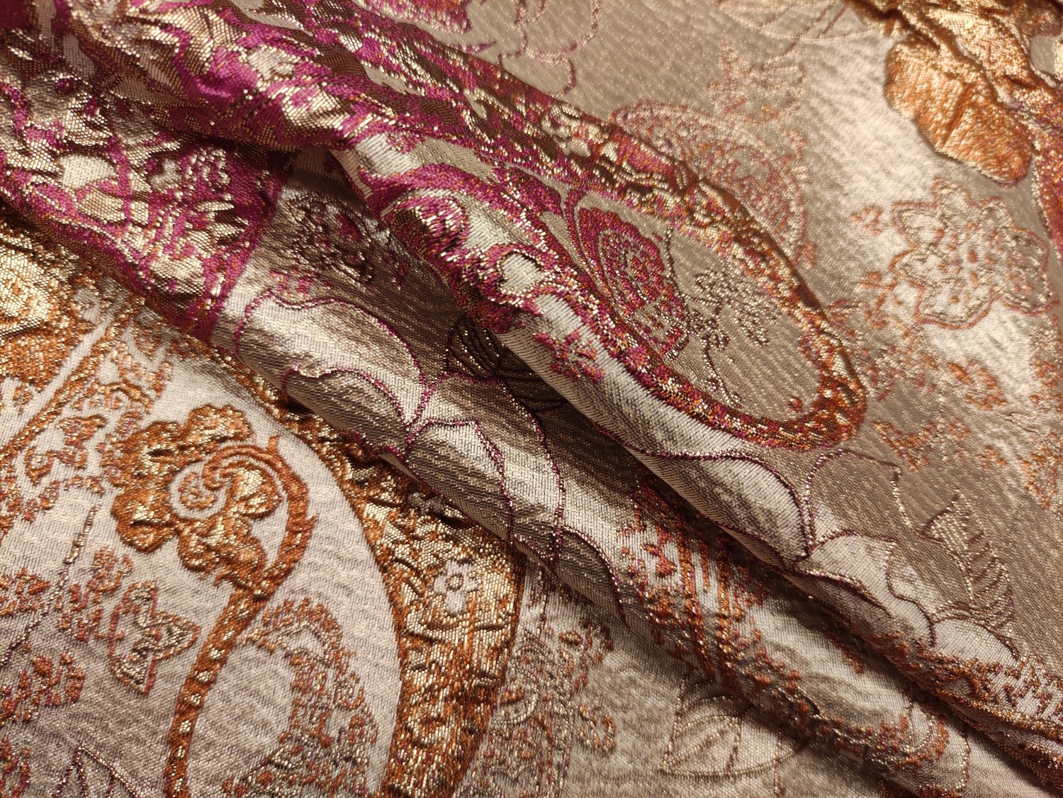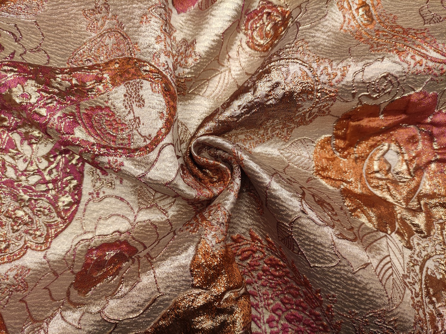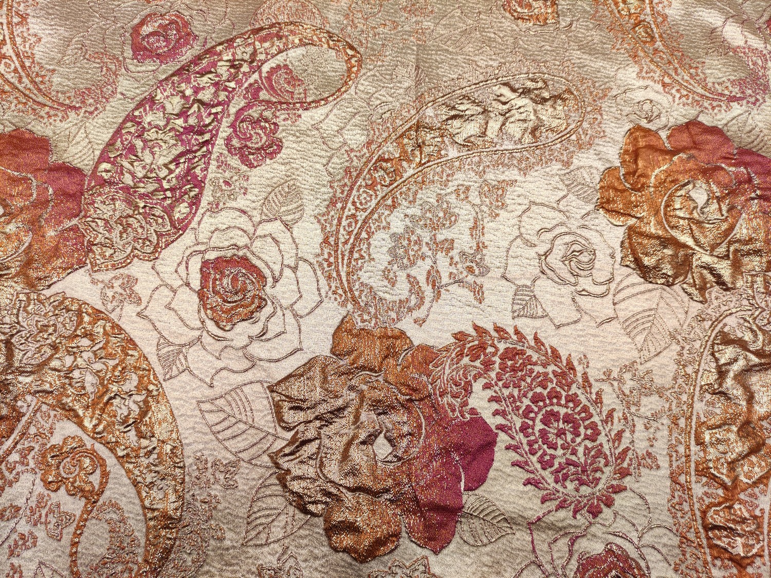 Tessuto Broccato in seta motivo floreale cashmere corallo – oro – ruggine