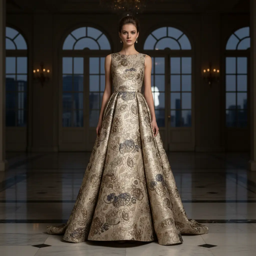 Tessuto Broccato in seta ideale per realizzare capi eleganti e strutturati, si presta alla creazione di abiti ampi, giacche e gonne.