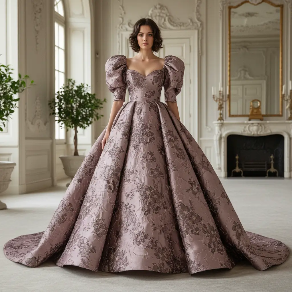 Tessuto Broccato in seta ideale per realizzare capi eleganti e strutturati, si presta alla creazione di abiti ampi, giacche e gonne.