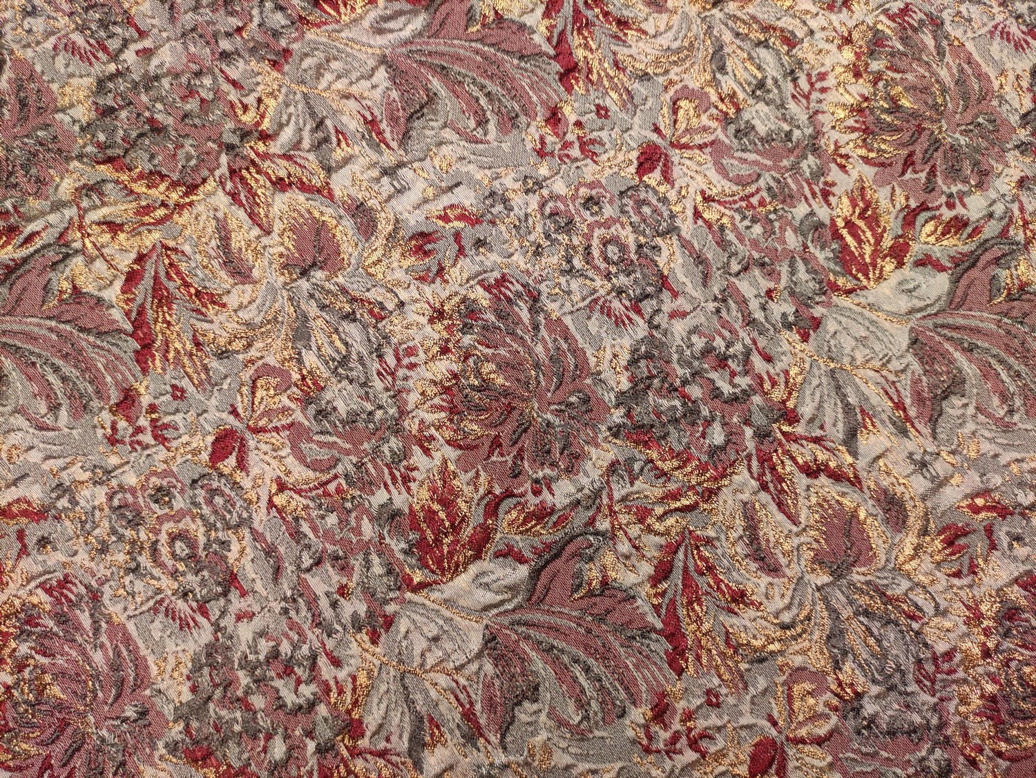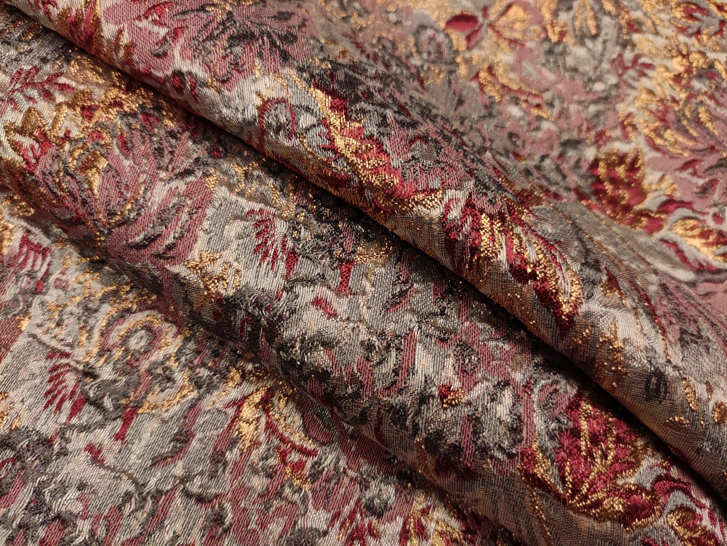 Tessuto Broccato in seta motivo floreale rosso – oro – grigio