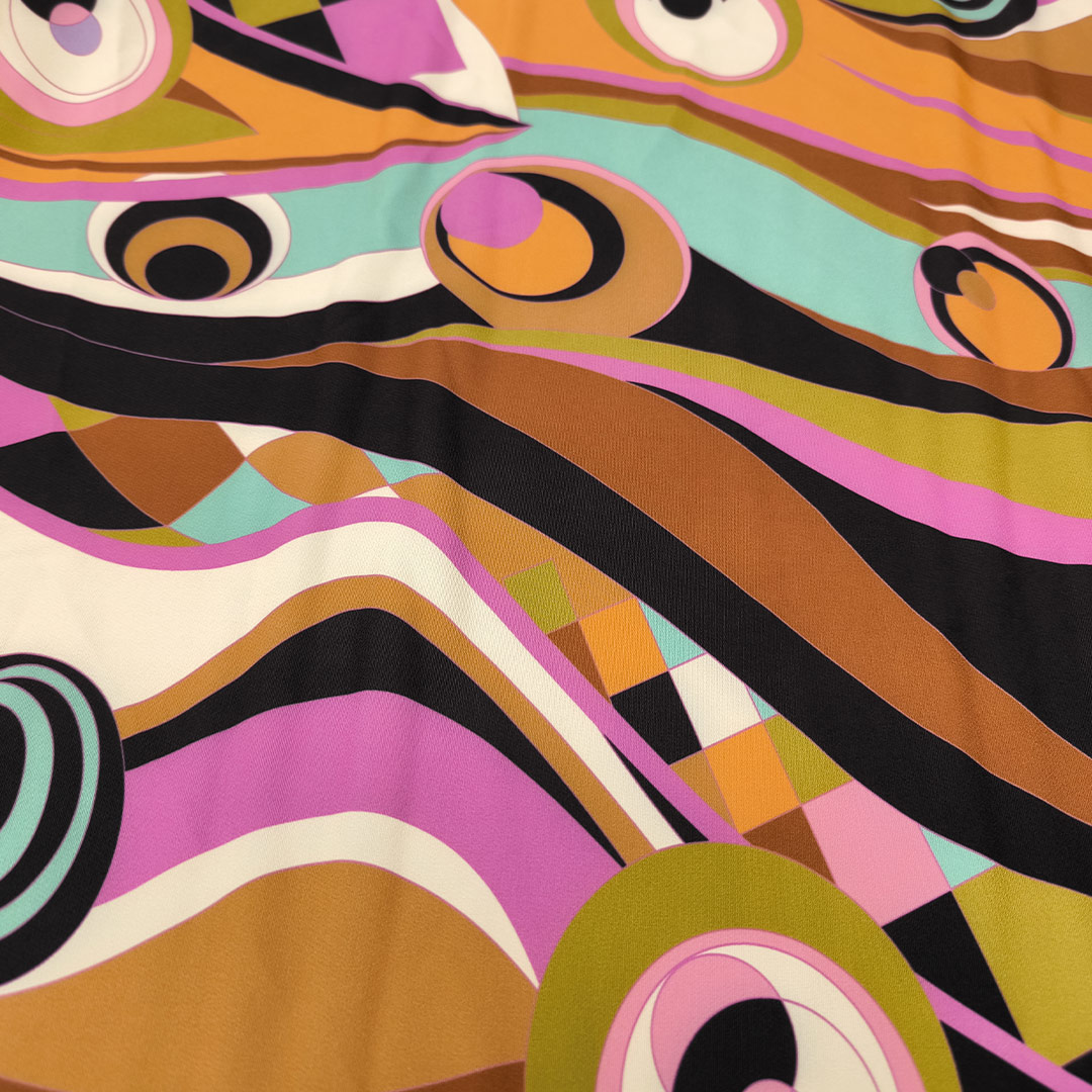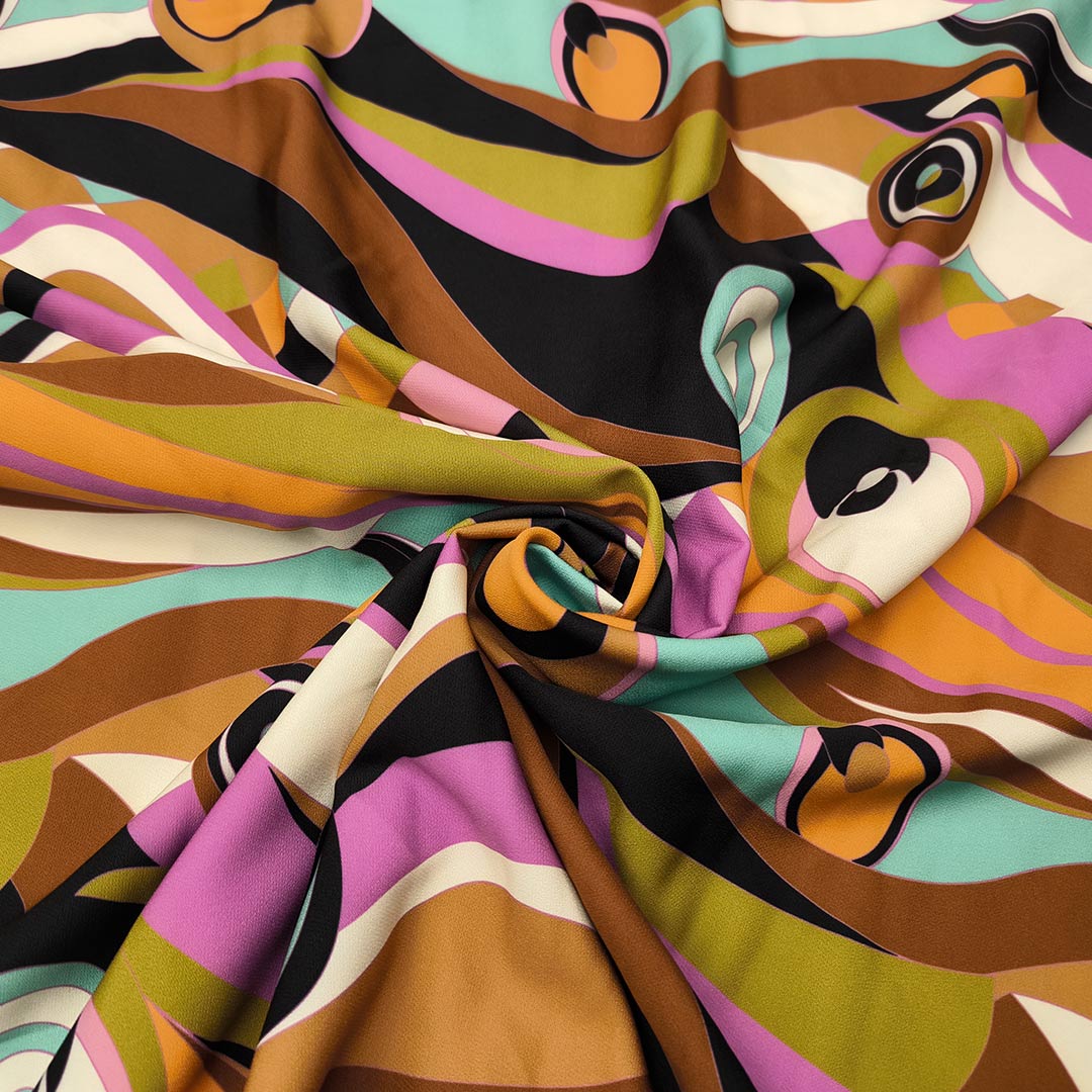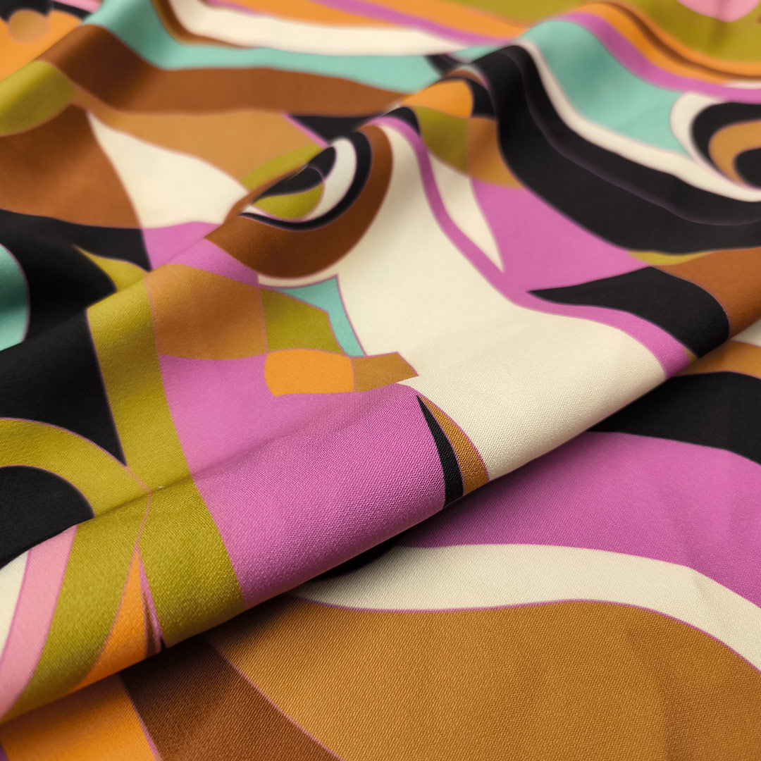 Tessuto Cady elasticizzato a fantasia motivo astratto nero – nocciola – tiffany – fucsia