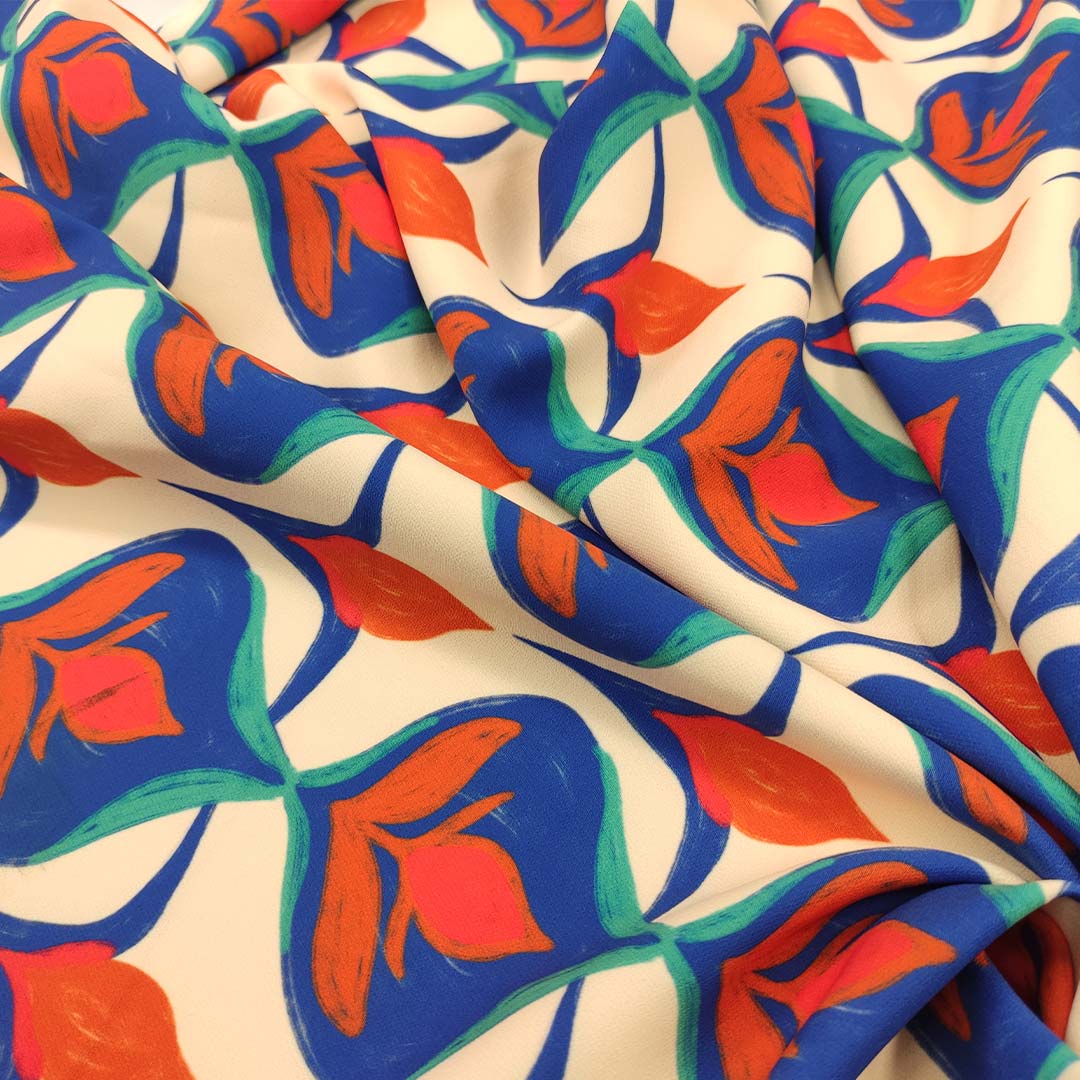 Tessuto Cady elasticizzato a fantasia motivo astratto panna – blu elettrico – arancio