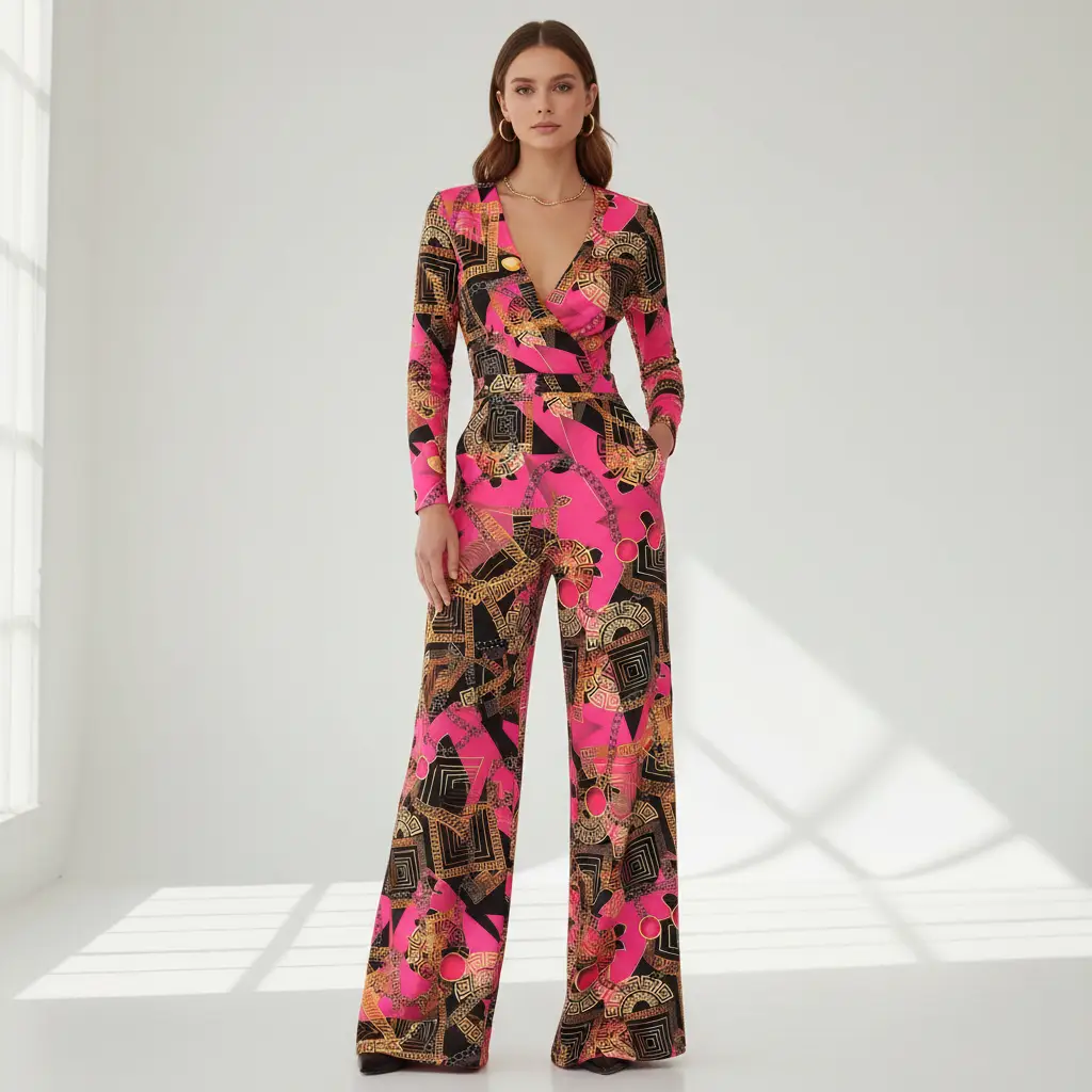 Tessuto Cady elasticizzato a fantasia motivo floreale barocco fucsia – oro – nero