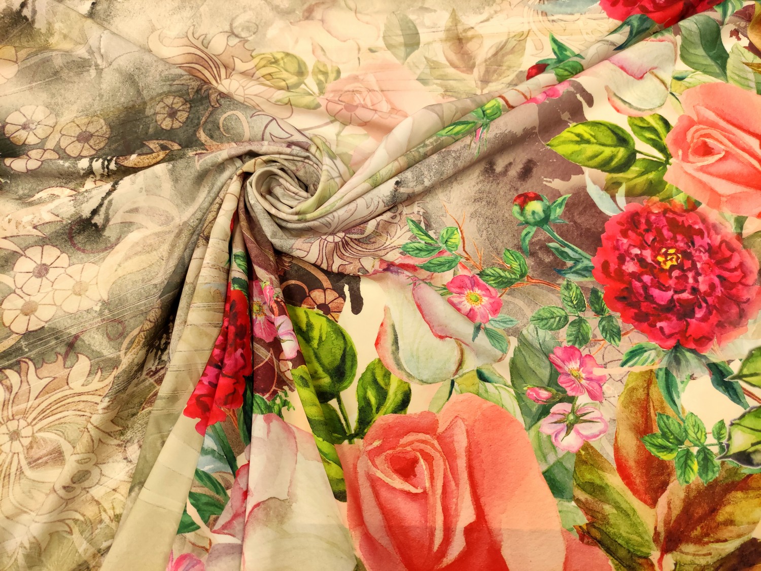 Tessuto Cady elasticizzato a fantasia motivo floreale beige – rosso