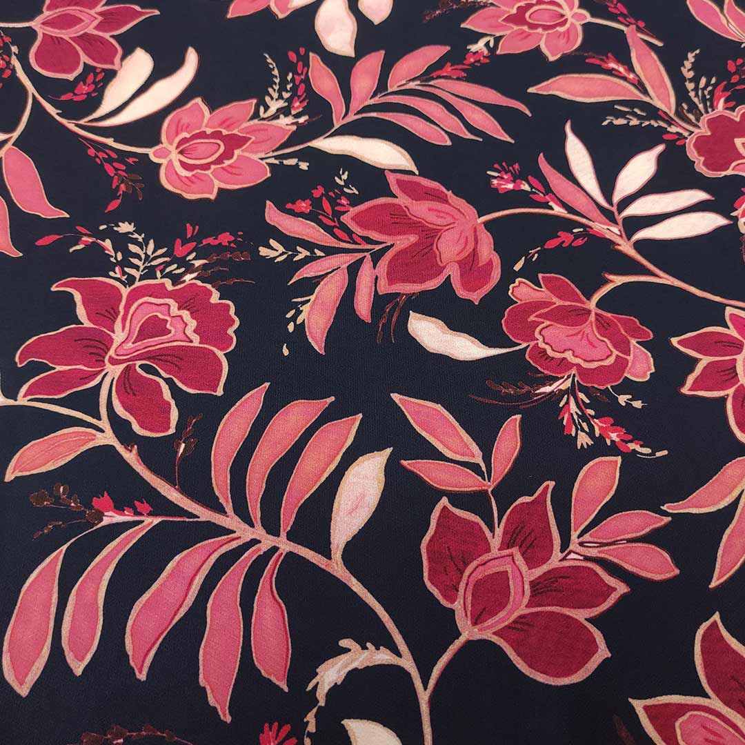 Tessuto Cady elasticizzato a fantasia motivo floreale blu – ciliegio