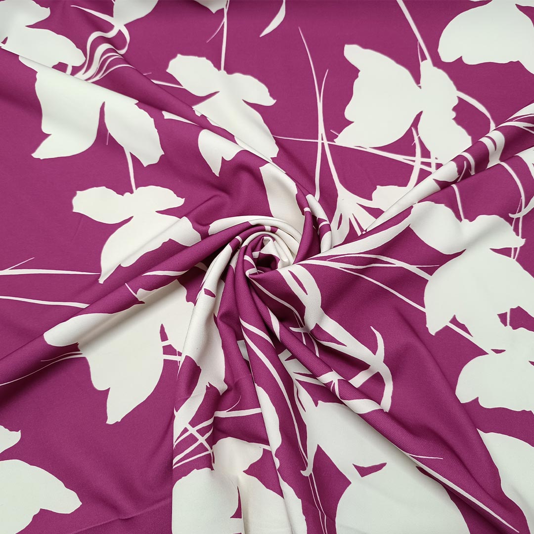 Tessuto Cady elasticizzato a fantasia motivo floreale ciclamino – bianco seta